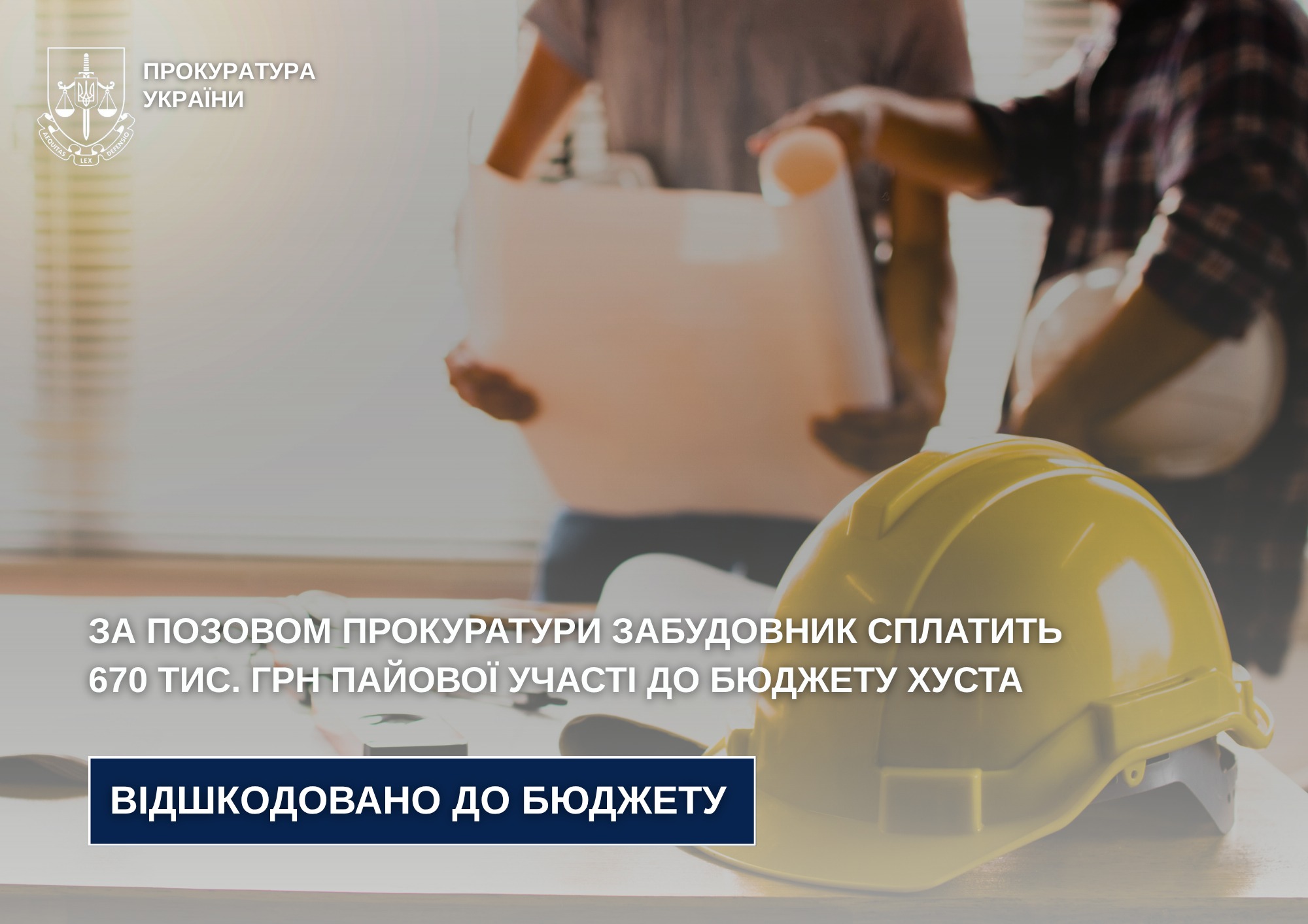 Хустська окружна прокуратура у судах першої та апеляційної інстанцій зобов’язала недобросовісного забудовника відшкодувати до місцевого бюджету 670 тис грн заборгованості зі сплати пайової участі у розвитку інженерно-транспортної та соціальної інфраструктури Хуста.