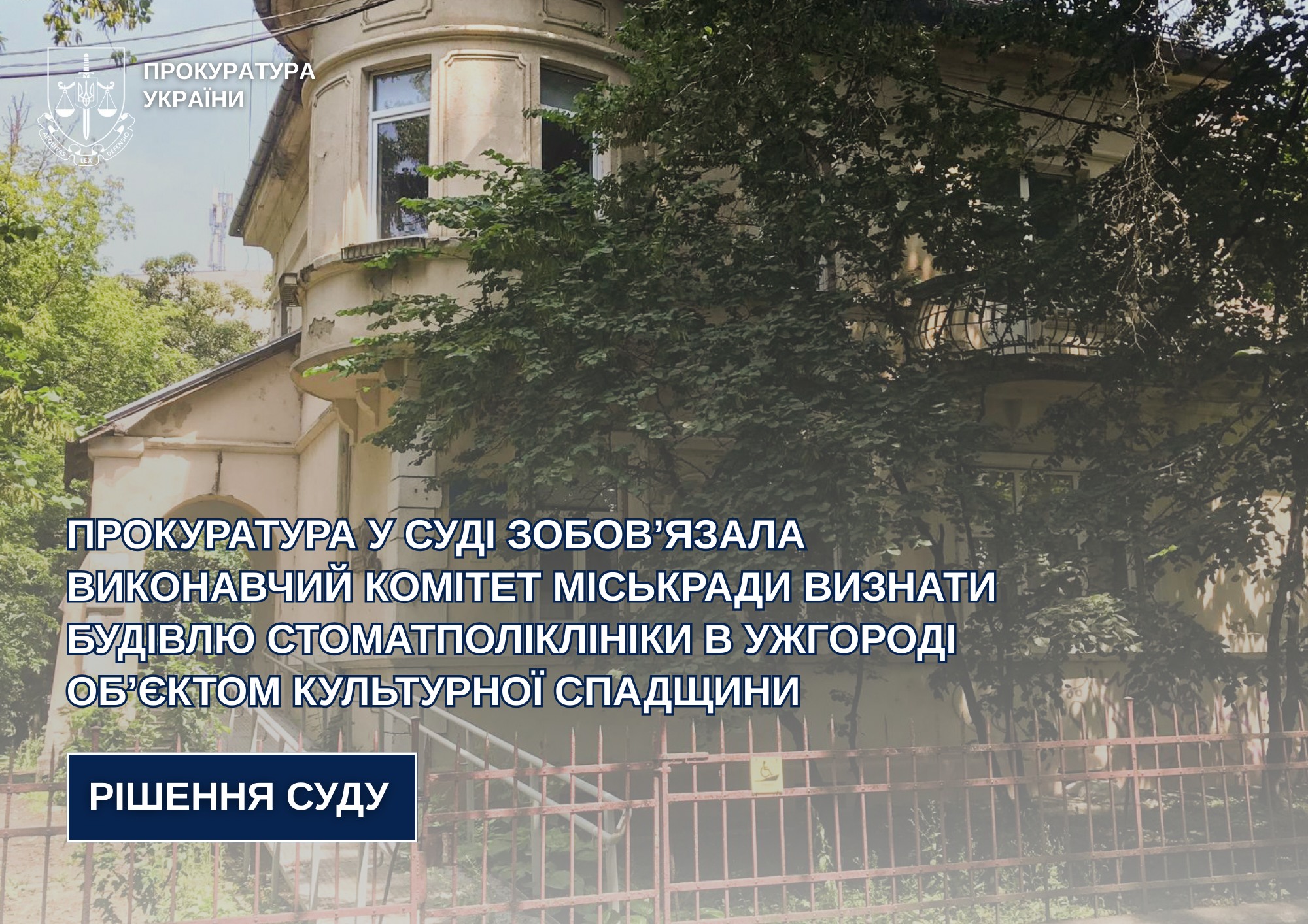 За доводами прокуратури у судах першої та апеляційної інстанцій зобов’язано виконком Ужгородської міської ради визнати будівлю стоматполіклініки в історичному ареалі м. Ужгорода щойновиявленим об’єктом культурної спадщини.