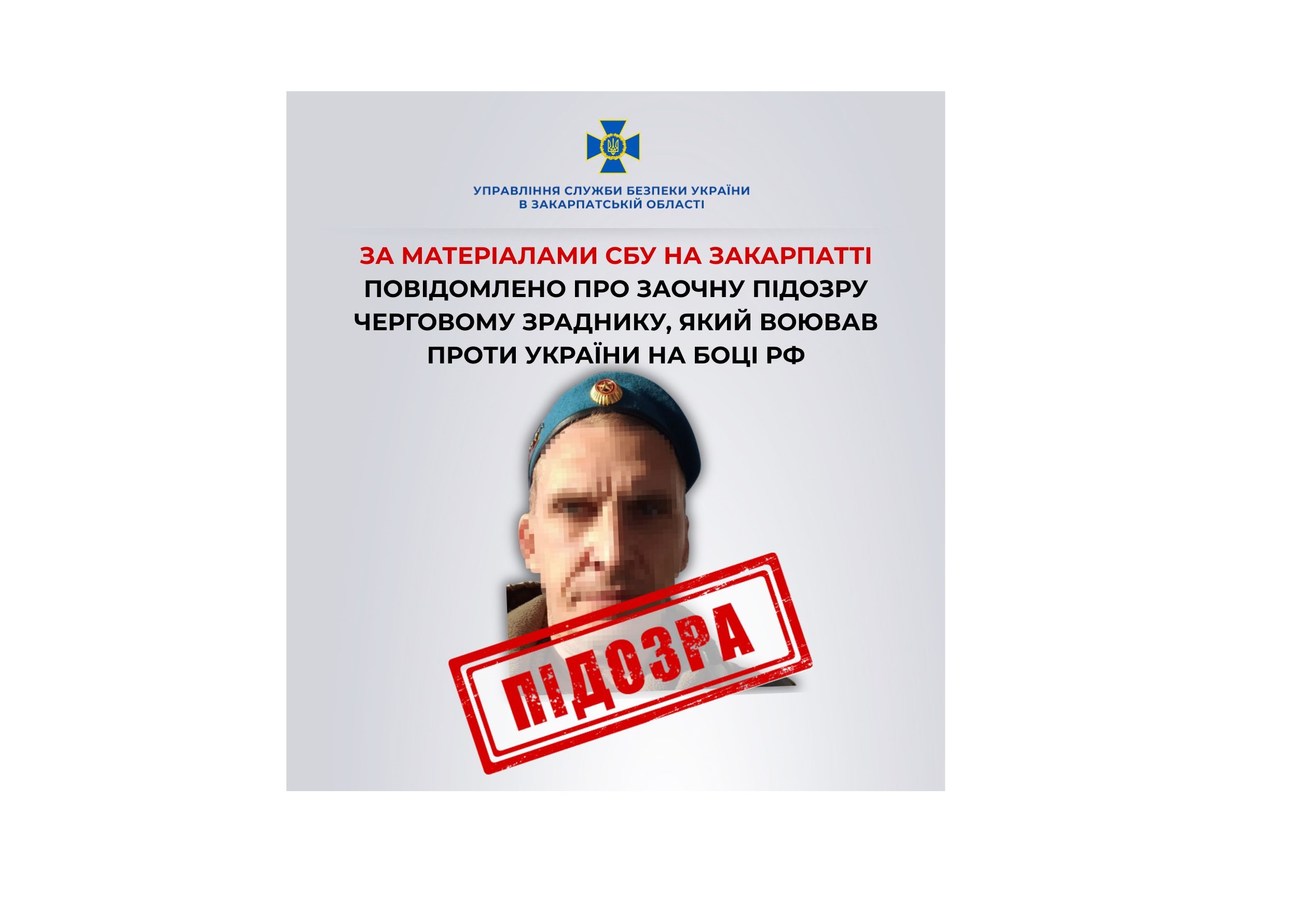 За матеріалами СБУ на Закарпатті повідомлено про заочну підозру черговому зраднику, який воював проти України на боці рф