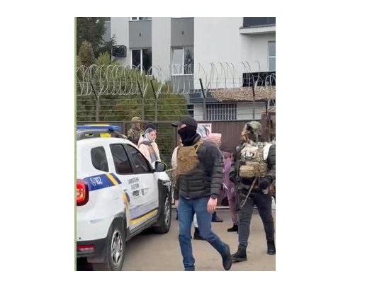 відео одну з груп працівників Служби безпеки України, які покидають будівлю міського ТЦК в Ужгороді після