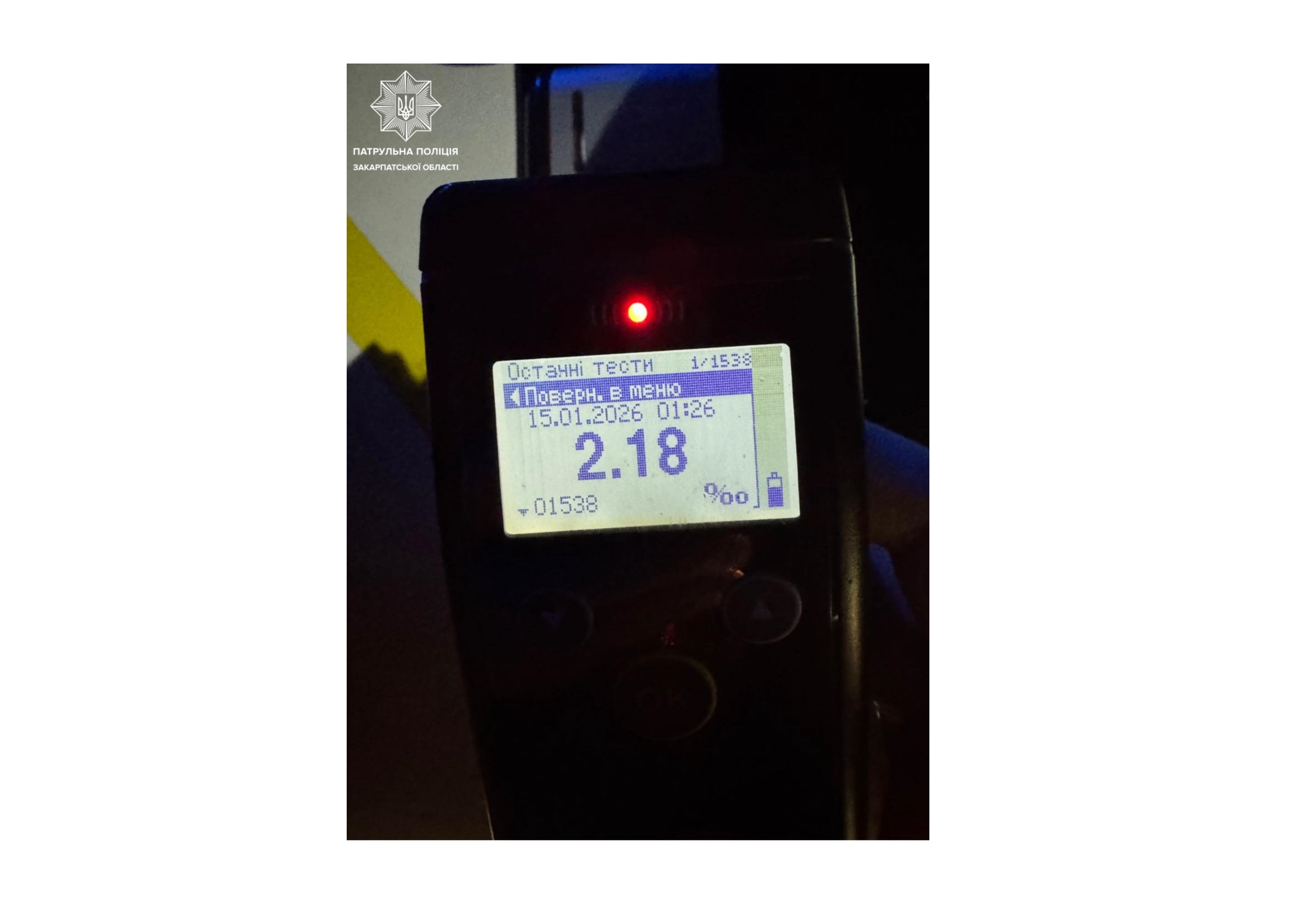 Водієві запропонували пройти огляд на стан сп’яніння на місці зупинки, на що він погодився. Результат — 2,18 ‰, що майже у 11 разі перевищує допустиму законом норму.