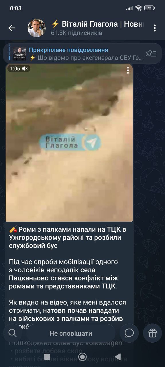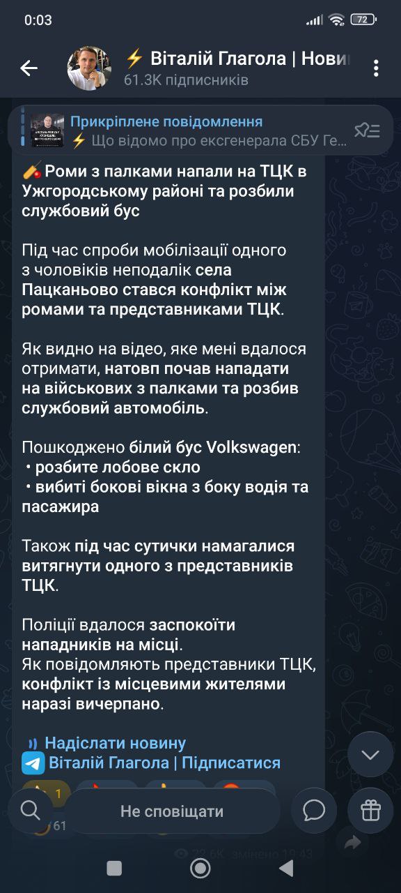 Під час спроби мобілізації одного з чоловіків неподалік села Пацканьово стався конфлікт між ромами та представниками ТЦК. Як видно на відео, яке вдалося отримати, натовп почав нападати на військових з палками та розбив службовий автомобіль. Про резонансну подію повідомив журналіст Віталій Глагола. Пошкоджено білий бус Volkswagen: • розбите лобове скло • вибиті бокові вікна з боку водія та пасажира