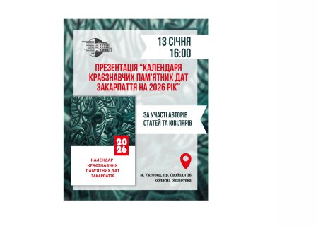 В Закарпатській обласній універсальній науковій бібліотеці ім. Ф. Потушняка презентують традиційний щорічник «Календар краєзнавчих пам’ятних дат Закарпаття на 2026 рік»