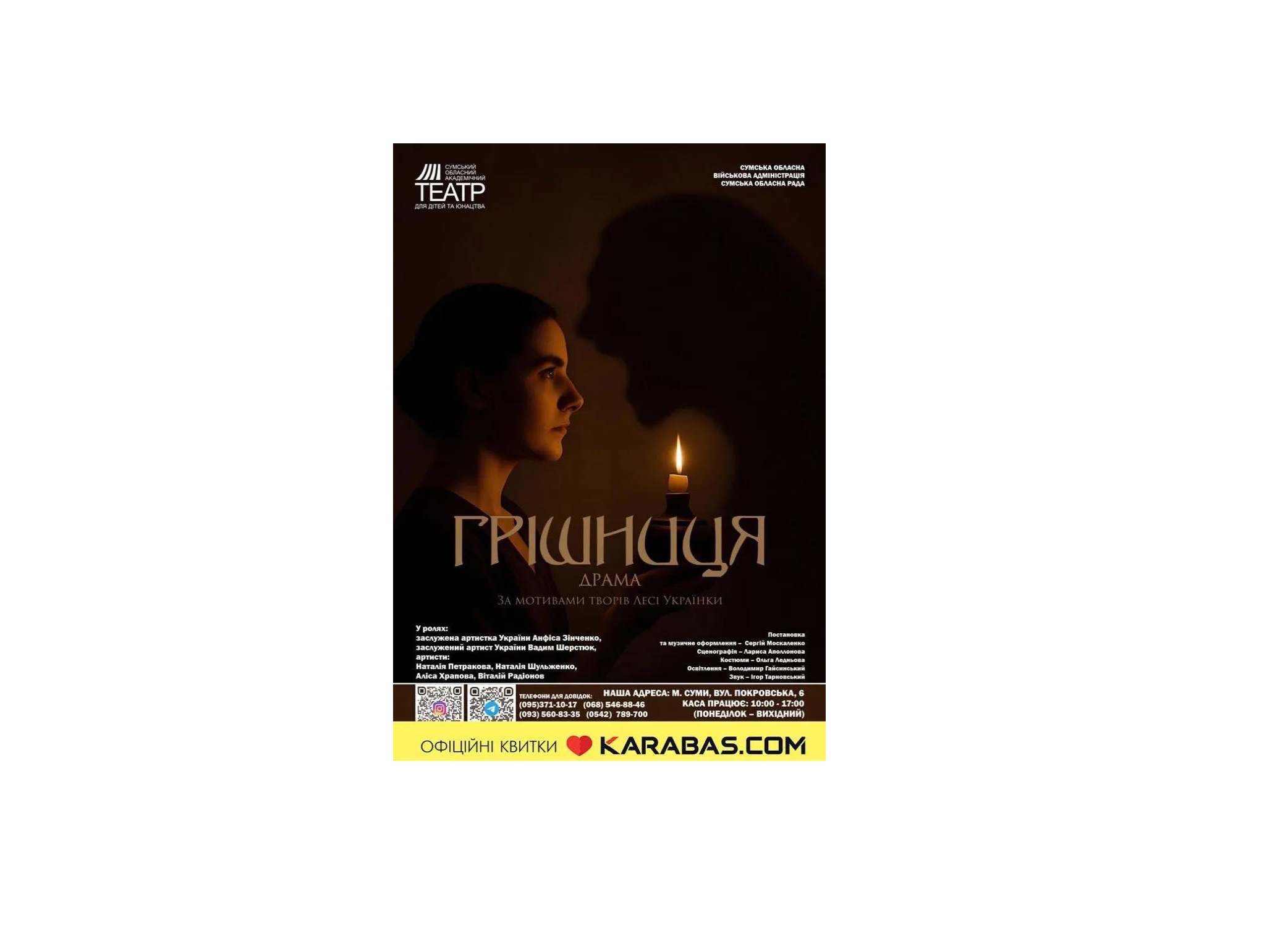 31 жовтня, на сцені Мукачівського драматичного театру Сумський обласний академічний театр для дітей та юнацтва представить драму «Грішниця» за мотивами творів Лесі Українки.