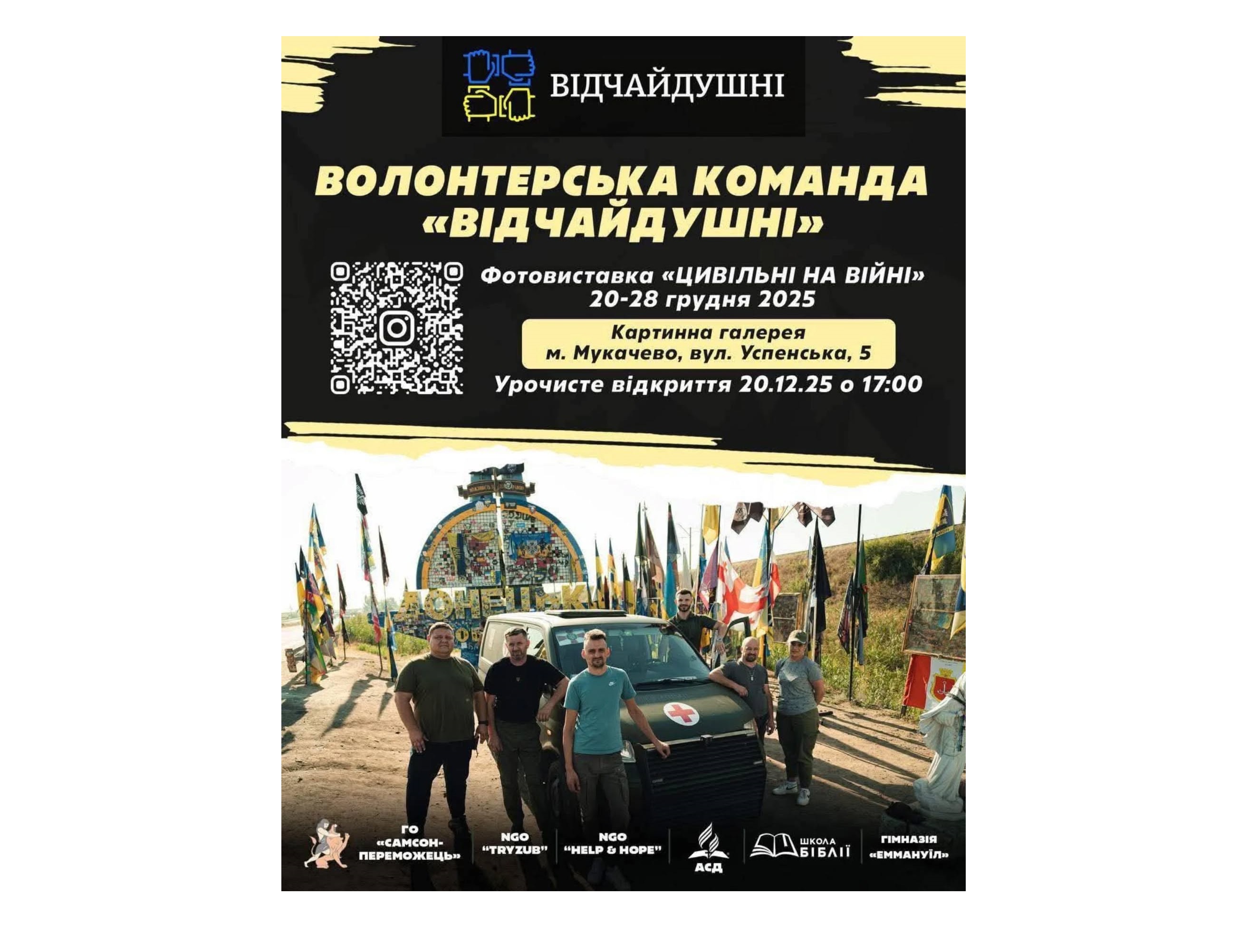 Волонтерська команда «Відчайдушні» організовує показ фотовиставки «Цивільні на війні». Виставка експонуватиметься у Мукачівській картинній галереї з 20 по 28 грудня.