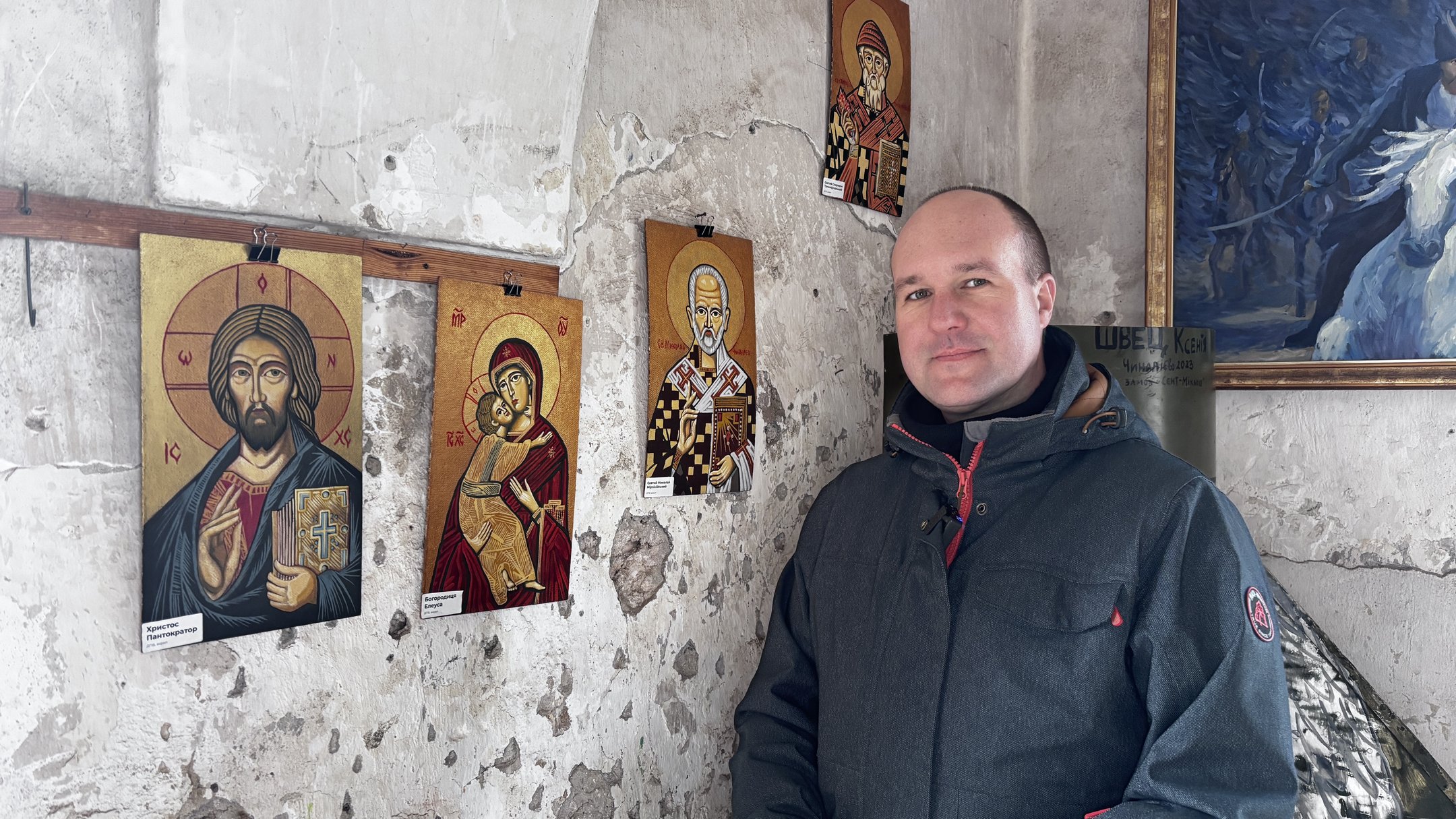 Роман Хмеляр — капітан поліції, учасник бойових дій під час АТО/ООС, був на ротаціях у батальйоні патрульної поліції особливого призначення Львова. У замку Сент-Міклош на Закарпатті пройшла його перша персональна виставка. Виставка Романа Хмеляра у Чинадіївському замку працювала 3 місяці. 14 лютого у замку Сент-Міклош у селі Чинадієво відбулося закриття виставки "Слідами легенд" художника і поліцейського управління патрульної поліції у Львівській області Романа Хмеляра. Про знайомство з художником Йосипом Бартошем Роман Хмеляр розповів Суспільному Ужгород. Чоловік закінчив художню школу, Володимир-Волинський педагогічний коледж та Львівську національну академію мистецтв. За фахом Роман — іконописець. На виставку привіз ікони, які були написані на звичайних плитах ДВП під час служби в Маріуполі до повномасштабного вторгнення."Ці ікони були написані в Маріуполі. У нас був такий дальній пост, дача. Ми оберігали обʼєкти життєзабезпечення міста. Нам казали: "8 км, і там вже ворожа територія". Ну не 8 км, там менше було", — пригадує художник. "Я не думав, що я взагалі щось малюватиму. А цього разу взяв з собою ті дощечки. І в мене була почата робота цієї Богородиці. Почав її писати, закінчив, і я зрозумів, що Богородиця сама не буде. Пішов Спаситель, далі Святий Миколай і Спиридон Тримифунтський. Ці ікони були написані на дальніх постах, які в нас були. Будиночок був ХХ століття, але умови були приблизно як цьому замку. Розбита штукатурка, виглядає цегла, сліди від осколків, від прильотів мінометних, які там бували. Те, що було, розбите, розграбоване, в тих місцях і малювалося. І в тих місцях найбільше якраз таки зверталося питання до ікони, до молитви. Це та молитва, не ту, яку знаємо, яку ми вчили, яку нас хтось заставляв вчити, чи ту, яку ми обрали вивчити, а та внутрішня молитва, яка йде від серця в той момент, коли не знаєш, що і як далі буде",— поділився Роман Хмеляр. Художник розповів, багато картин були написані в місцях, які пов'язані з певними легендами.За словами поліцейського, минулого року він познайомився з Йосипом Бартошем — художником, меценатом, який відомий орендою та відновленням замку "Сент-Міклош". Роман знав про його проєкт, де він малює на уламках ракет. Під час зустрічі із ним поліцейський написав ікону Святого Миколая. Серед робіт Романа Хмеляра є також пейзажі та портрети. Автор виставки також вміє грати на гітарі, він заспівав колискову на закритті виставки, яку написав для сина Данила, коли той був немовлям."Не малювати я не можу — все-таки закінчив Львівську національну академію мистецтв. Перед тим Володимир-Волинський педагогічний коледж, а ще — художню школа. І це вже не один рік. Як вам сказати, залежність це, можна сказати. Хороша залежність. І були такі дні, що якщо 15 хвилин на день не помалюю, то я не міг заснути", — розповів він.