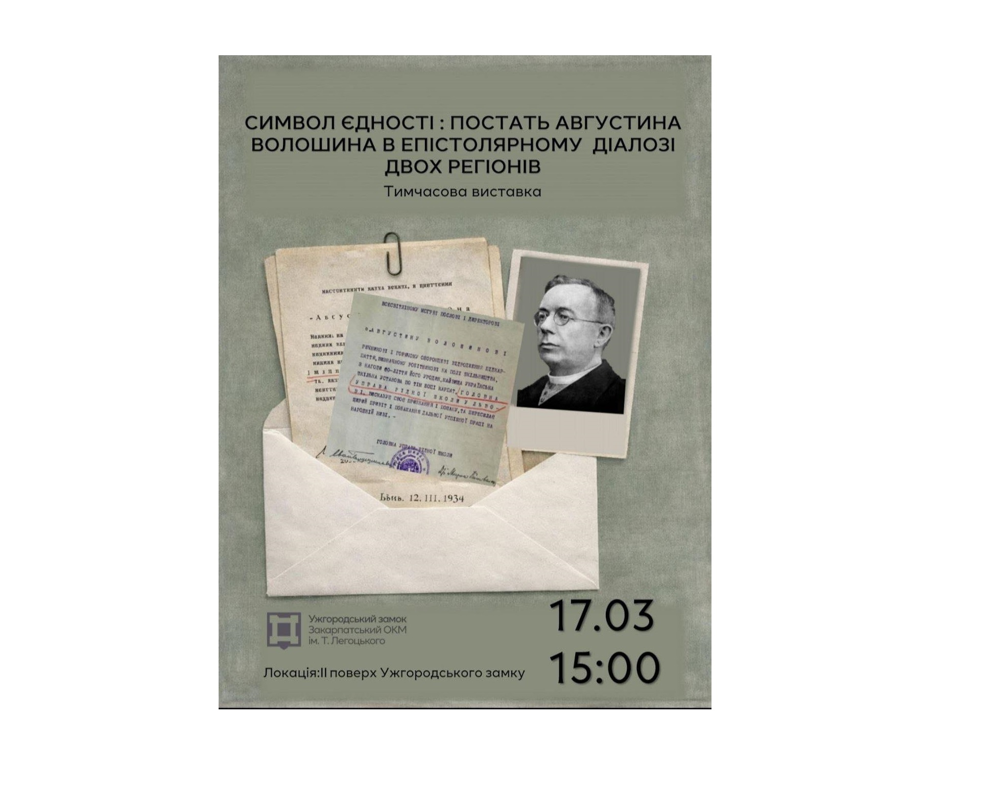 17 березня 2026 року о 15:00 год. у Закарпатському обласному краєзнавчому музеї ім. Тиводара Легоцького відбудеться відкриття тимчасової виставки «Символ єдності: постать Августина Волошина в епістолярному діалозі двох регіонів».