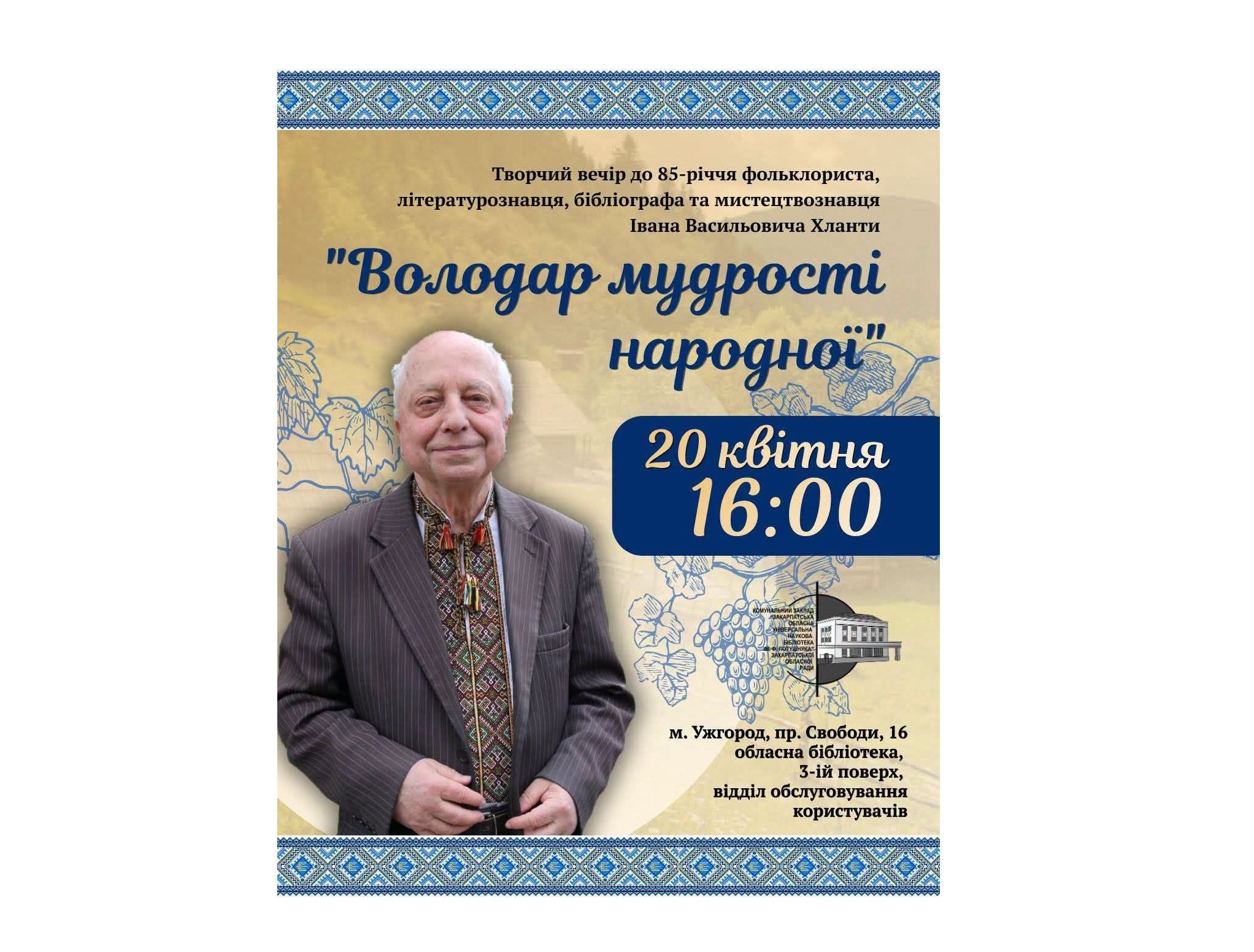 20 квітня Іван Хланта – провідний методист відділу народної творчості та аматорського мистецтва КЗ «Обласний організаційно-методичний центр культури» Закарпатської обласної ради, заслужений діяч мистецтв України відзначатиме славний 85-річний ювілей.