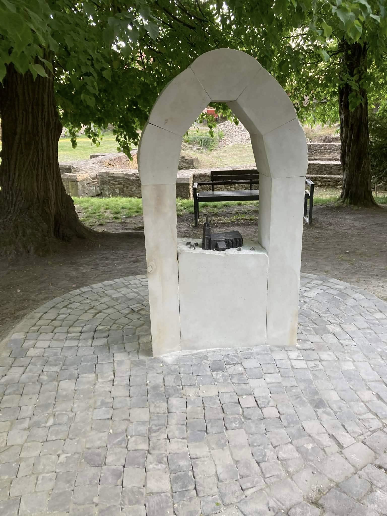 Це символічна композиція: бронзовий храм, розміщений всередині травертинової арки. Саме тут відтворено історичний момент, коли священники зібралися для проголошення об’єднання церков. У результаті цієї події було утворено Мукачівсько-Ужгородську греко-католицьку єпархію.