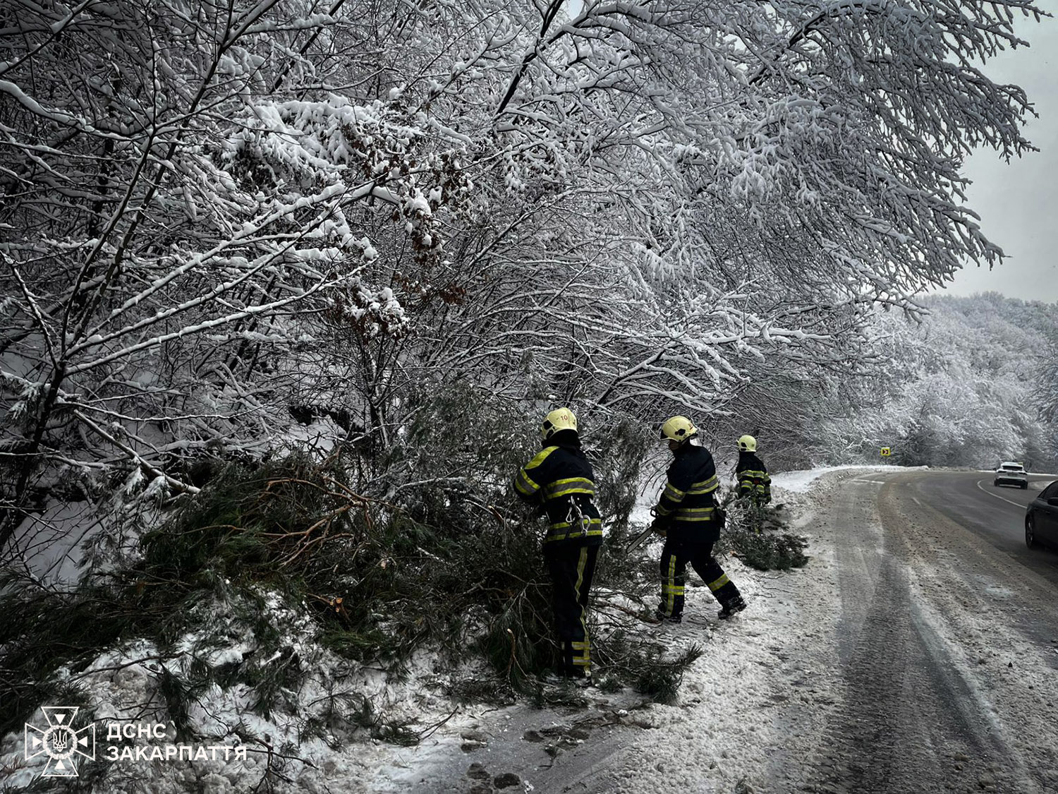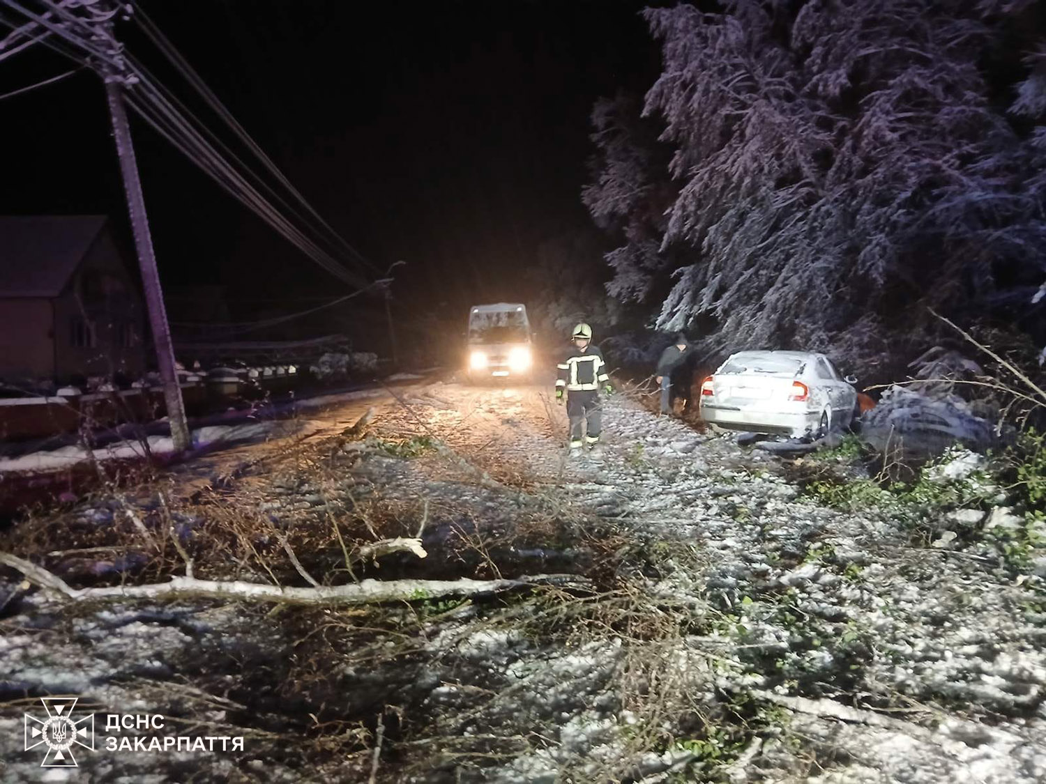 Через сильний сніг та вітер на Закарпатті дерева падали на автошляхи та автомобілі (ФОТО)