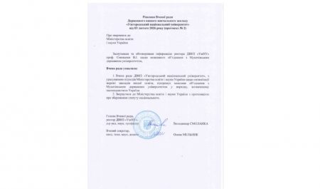 Заслухавши та обговоривши інформацію ректора УжНУ проф. Володимира Смоланки щодо можливого обʼєднання з Мукачівським державним університетом, Вчена рада ухвалила – підтримати можливе обʼєднання з урахуванням підходів Міністерства освіти і науки України щодо оптимізації мережі вишів у порядку, визначеному законодавством України. А також звернутися до Міністерства освіти і науки України щодо збереження почесного статусу національного у разі такого об’єднання.