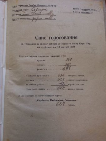 "12 лютого 1939 року відбулися вибори до Сойму Карпатської України Загальний результат по Карпатській Україні за проурядову партію УНО становив 92,4% голосів тих, хто проголосував.