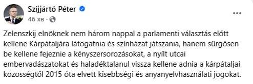 Президент Зеленський не повинен відвідувати Закарпаття за три дні до парламентських виборів і показувати театральні вистави, а має терміново припинити примусовий призов, розпочаті вуличні полювання на людей та негайно повернути права меншин та рідної мови, відібрані у закарпатської громади з 2015 року" - обурливо написав Петер Сіярто.