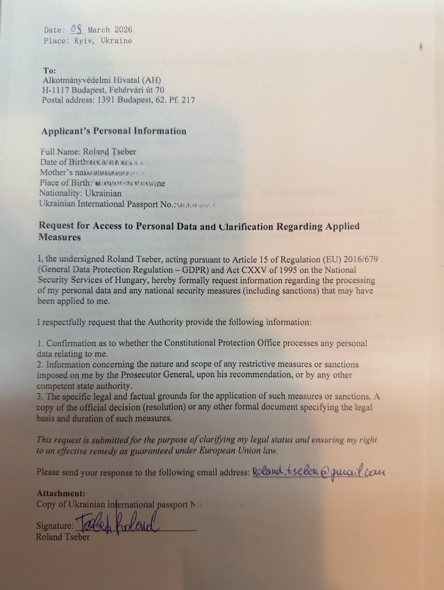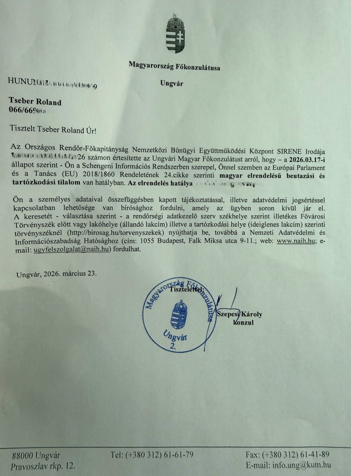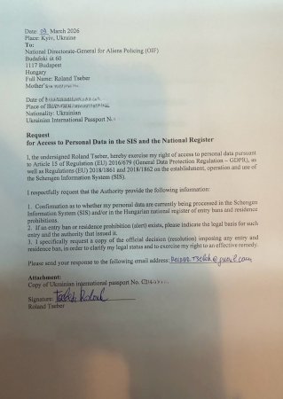 "09.03.2026 року я черговий раз офіційно звернувся до правоохоронних та державних органів Угорщини — Національної поліції (ORFK), міжнародного центру NEBEK (SIRENE), міграційної служби (OIF) та Управління захисту Конституції (AH).