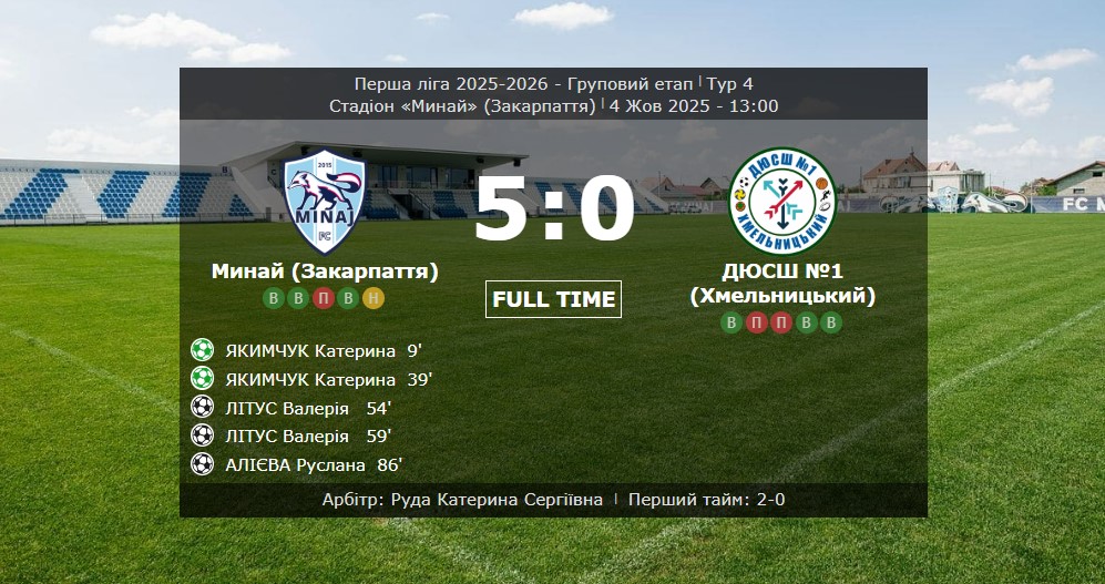 Вчора, 4 жовтня 2025 року, жіноча команда «Минай» впевнено обіграла команду ДЮСШ №1 з Хмельницького на домашньому полі з розгромним рахунком 5:0 в межах Чемпіонату України з футболу. Завдяки цьому результату закарпатки забезпечили собі позицію лідера у групі «А».