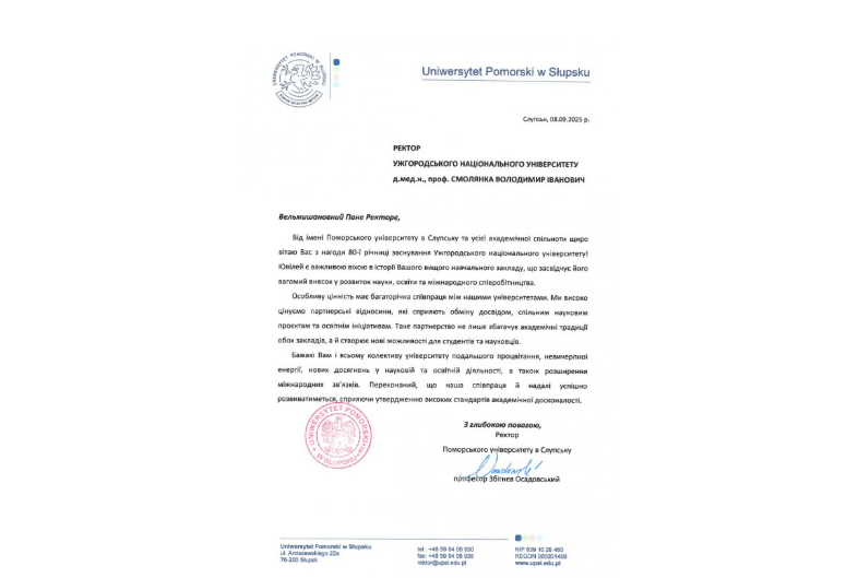 Ректор Поморського університету в Слупську (Польща) професор Збігнєв Осадовський, щиро привітав ужнівську спільноту з важливим ювілеєм вищого навчального закладу “Ужгородський Національний Університет”, адже це засвідчує його вагомий внесок у розвиток науки, освіти та міжнародного співробітництва. Він наголосив на цінності багаторічної співпраці між університетами, яка сприяє обміну досвідом, спільним науковим проєктам та освітнім ініціативам. Він переконаний, що таке партнерство збагачує академічні традиції обох закладів і створює нові можливості для студентів та науковців. Ректор побажав всьому колективу університету подальшого процвітання, невичерпної енергії, нових досягнень у науковій та освітній діяльності, а також розширення міжнародних зв'язків.