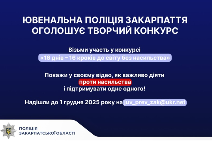 У межах щорічної Міжнародної акції «16 днів проти насильства» ювенальна поліція Закарпаття запрошує підлітків віком від 15 до 17 років взяти участь в інформаційно-просвітницькому творчому конкурсі «16 днів – 16 кроків до світу без насильства»