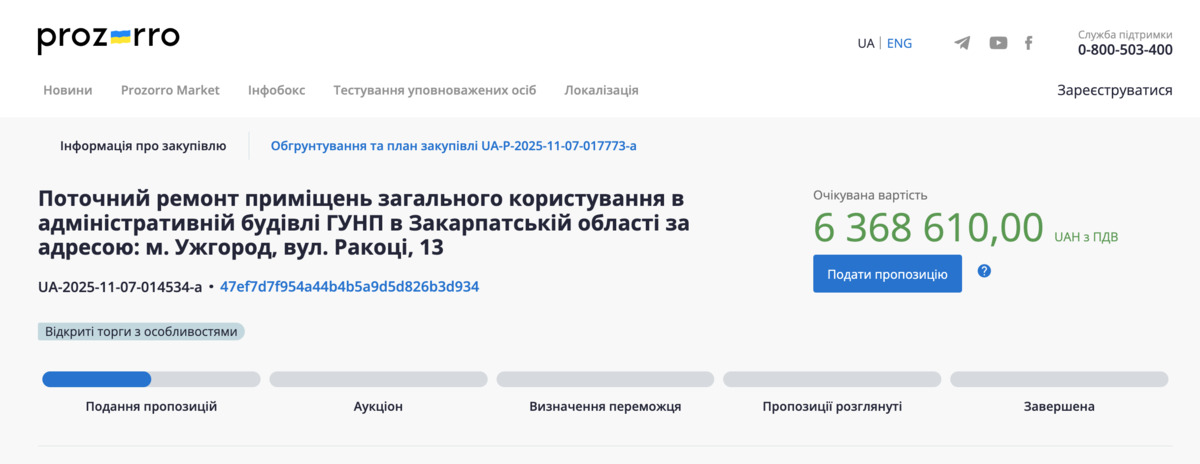 7 листопада 2025 року оголосили тендер на капремонт приміщень адмінбудівлі поліції в Ужгороді. На це готові виділити 6 мільйонів 368 тисяч 610 гривень. Замовник – ГУНП в Закарпатській області. Заявки від потенційних учасників торгів приймають до 15 листопада. Зазначається, що кожен може подати лише одну тендерну пропозицію.