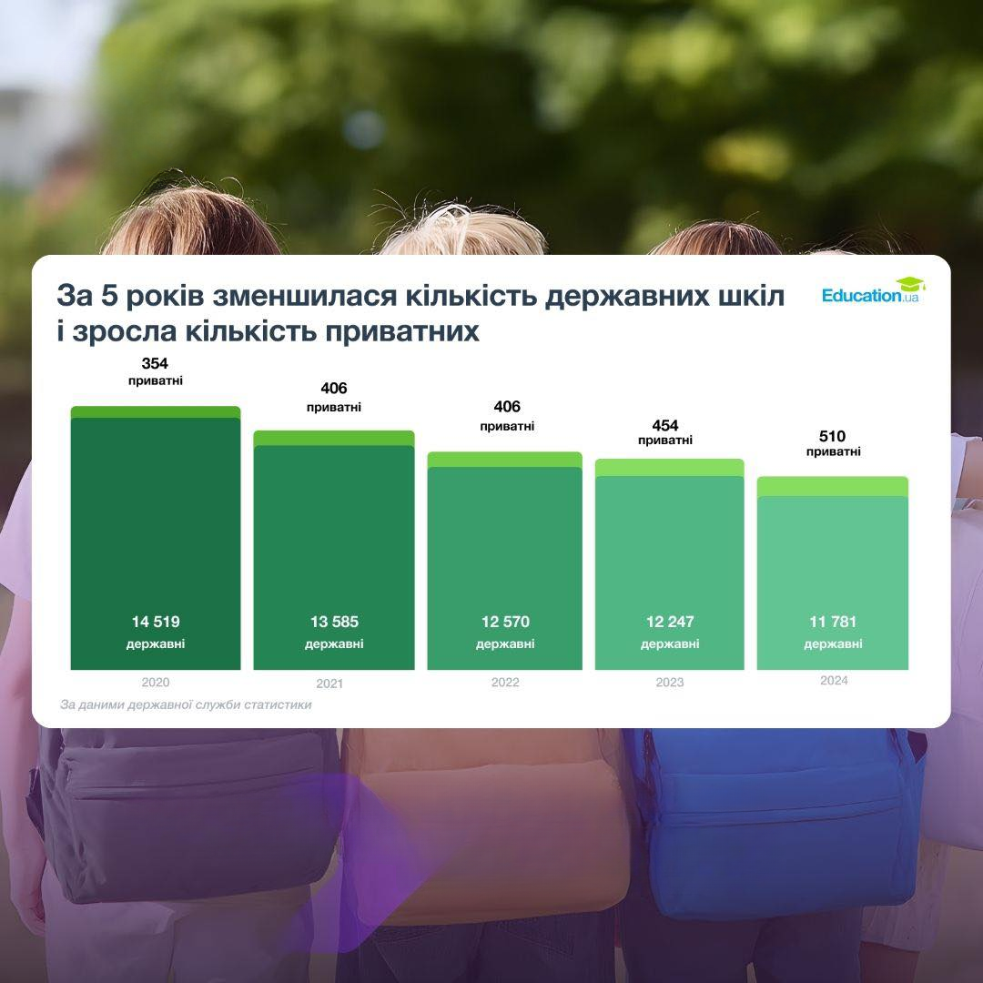 Загалом в Україні за п’ять років кількість державних шкіл скоротилася на 19%, тоді як приватних — навпаки, побільшало до 510.