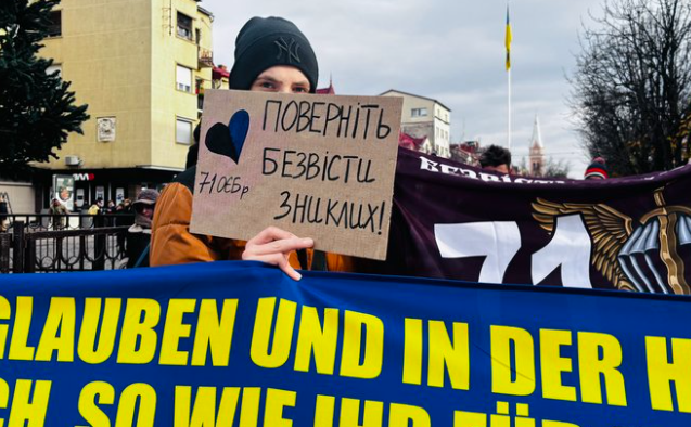 На площі Кирила та Мефодія у Мукачеві 29 листопада відбулась акція на підтримку військовослужбовців, які зараз перебувають у полоні та зникли безвісти. Про це повідомила кореспондентка Суспільного з місця події. Захід розпочався о 14-й годині. Для проведення акції до Мукачева привезли Державний прапор України з портретами майже шести тисяч зниклих безвісти українців та військовополонених. Довжина прапору — 170 метрів. На ньому — 5 800 фотографій. Організатори мирної ходи у Мукачеві — переважно родичі військових, які чекають рідних з полону або шукають їх. Проводить акцію активістка Аліна Власенко, представниця ГО "Звільніть усіх". Перед людьми виступив колишній військовополонений Олександр Стогнієнко — захисник Азовсталі, який провів у полоні 3,5 роки. Також під час акції священник Мукачівської греко-католицької єпархії Іван Кузьма провів молитву за всіх воїнів, які перебувають у полоні, а також тими, котрі вважаються безвісти зниклими. Акція завершилась близько 16:00 біля пам'ятника воїнам-захисникам у меморіальному парку біля ДЮСШ.
