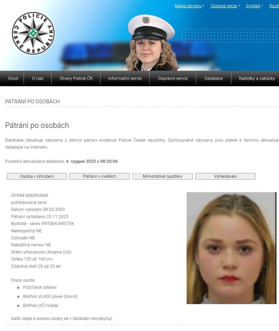 Чеська поліція розшукує Офрім Андріяну, жительку Рахівського району. Офіційно її було подано в розшук 21.11.2025.