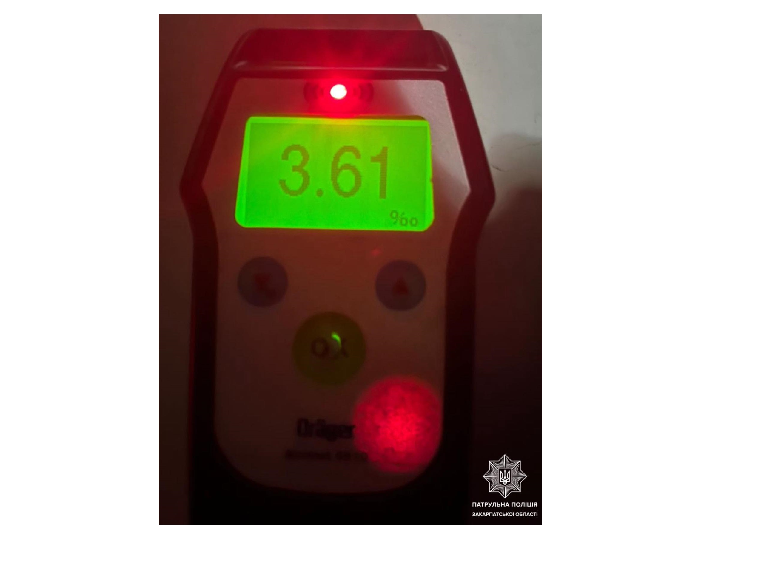 Огляд на стан алкогольного сп’яніння провели на місці. Результат — позитивний, 3,61‰.