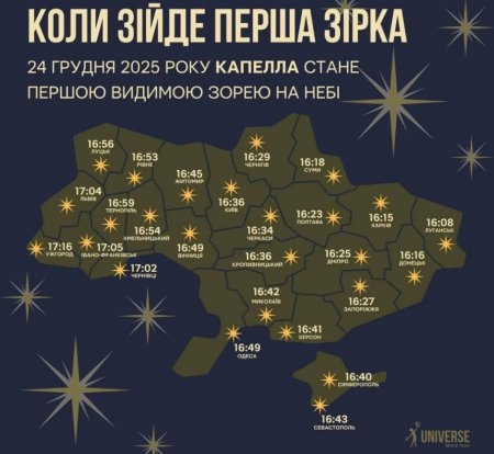У Святвечір, 24 грудня, першою видимою зіркою над Україною стане Капелла — яскраве світило у сузір’ї Візничого. Над Закарпаттям зірка зійде о 17:16.