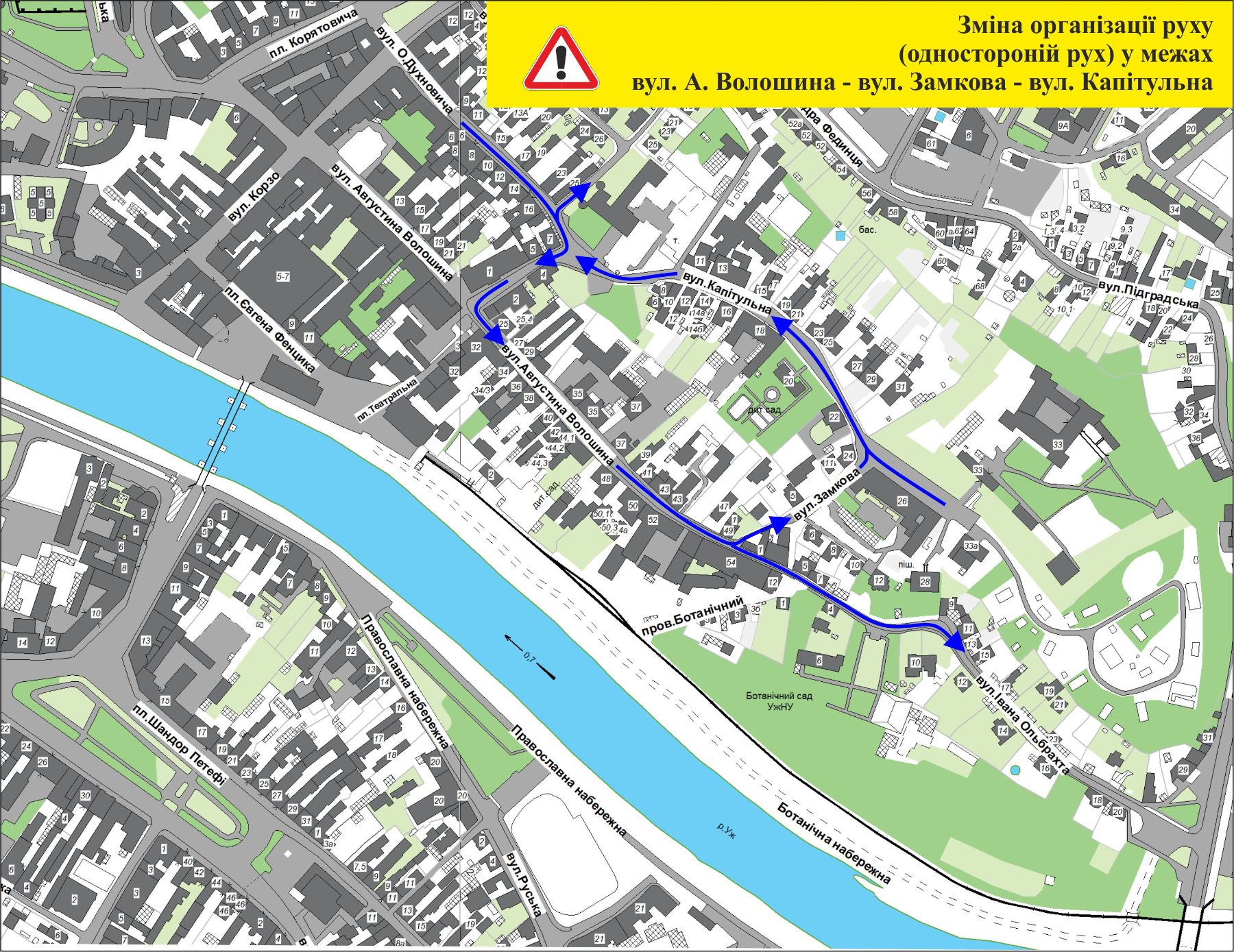 Із вечора 27 грудня в Ужгороді на вулицях Капітульній та Замковій запроваджується односторонній рух згідно з новою схемою організації дорожнього руху.