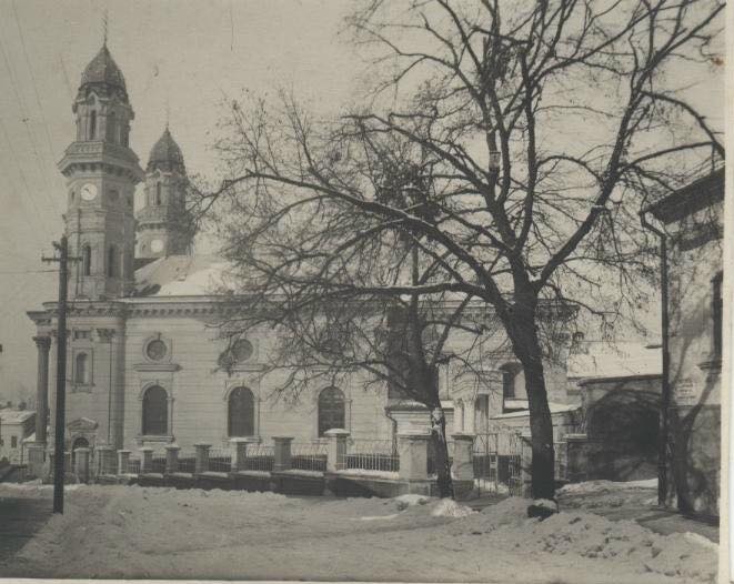 Інша фотографія зображує панораму зимового міста з підвищення: засніжена дорога веде вглиб міського простору, вздовж неї простягаються огорожі й дерева без листя, а поодинокі постаті перехожих пожвавлюють краєвид. Удалині домінує одна зі знакових міських будівель, що формує силует Ужгорода й створює спокійний, ліричний образ міста, зануреного в тишу зими. Ще одна світлина зафіксувала монументальну архітектурну споруду Мукачівської греко-католицької єпархії. Сніговий покрив підкреслює строгі лінії фасаду та велич будівлі, а відсутність людей у кадрі створює відчуття застиглого часу.