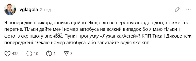 На своєму тг-каналі Віталій Глагола написав, що "італійцю Рокко на КПП «Чоп-Захонь» оформлюють картку відмови у вʼїзді в Україну і заборону в нашу державу на кілька років".