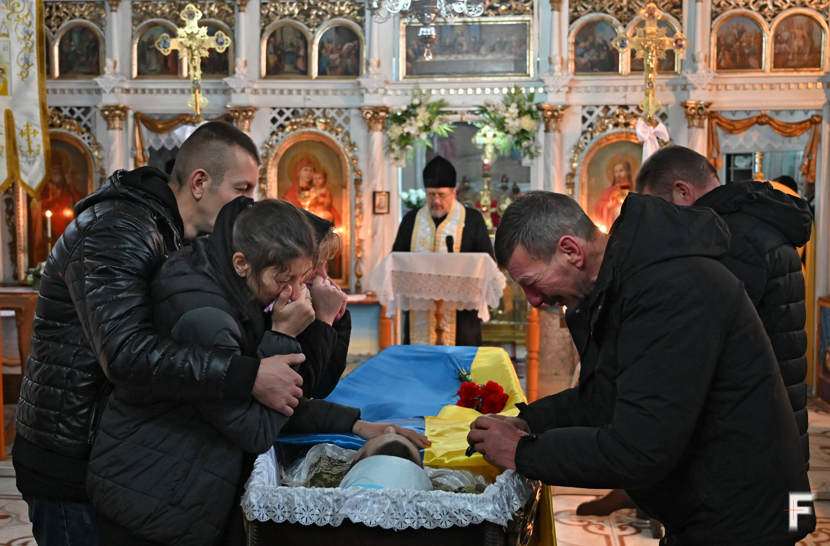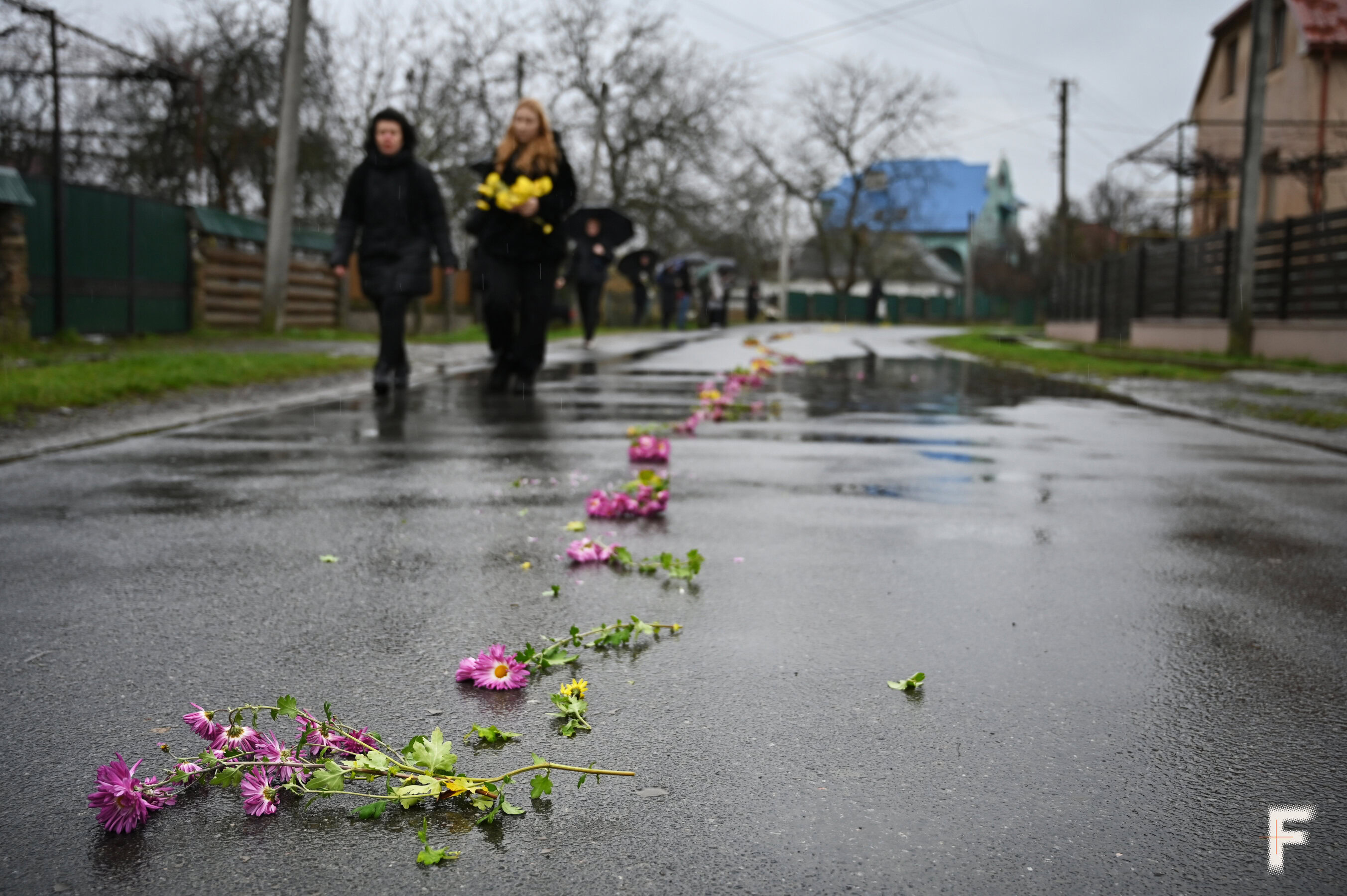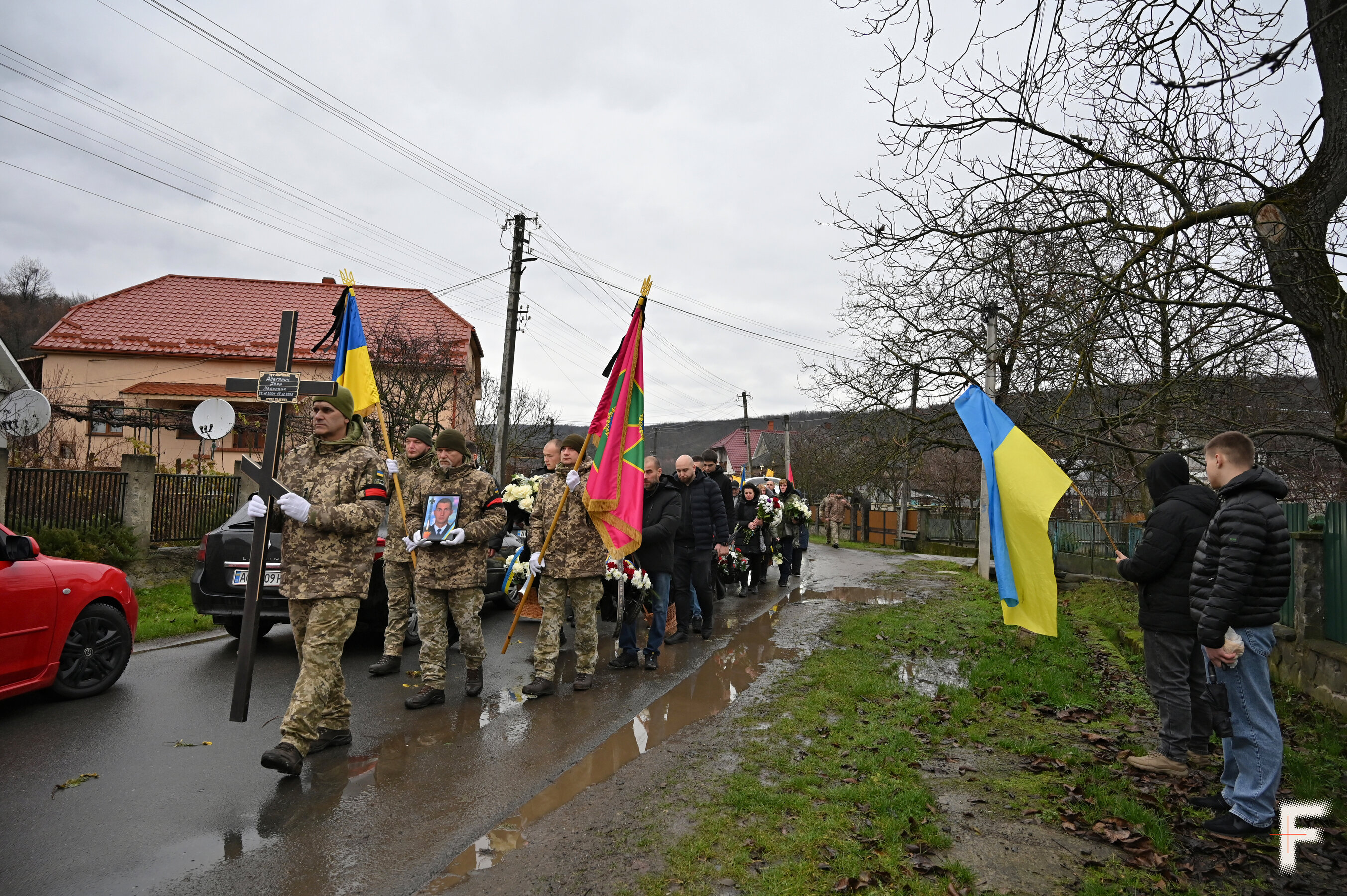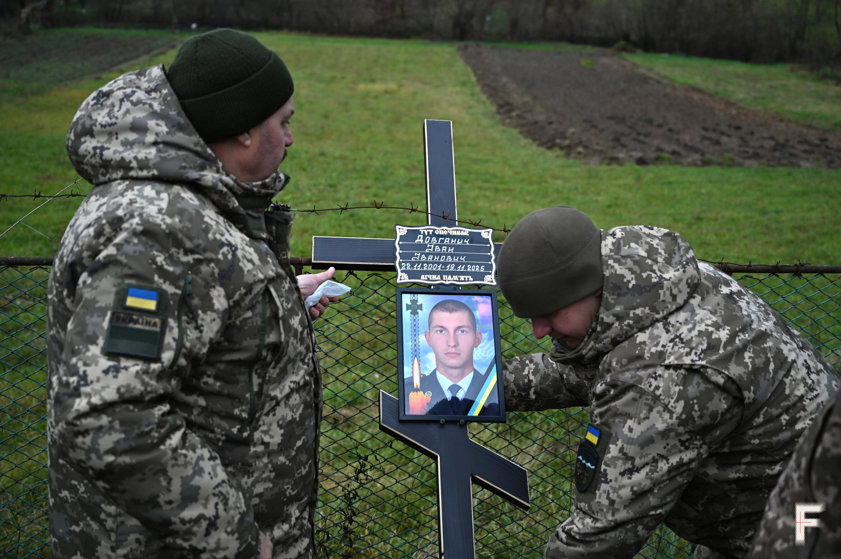 Великі Лази. Село під Ужгородом. Останні дні осені 2025 року. Ллє холодний дощ. Сіра дорога встелена яскравими осінніми квітами, що мають зустріти і водночас провести в останню дорогу воїна Івана Довганича. Прикордонника, який загинув за три дні до свого 24-го дня народження. Біля будинку військового зібралися рідні, друзі, однокласники, сусіди, знайомі, односельчани. У дворі – квіти і хоругви. Високий виноград накритий тентом: безжальний дощ просто ллє і ллє. Комусь із чоловіків доводиться палицею зливати воду, яка зібралася на тенті й в один момент може залити всіх, хто тут зібрався. Це – єдина активність у дворі. Решта людей застигли, навіть дихають обережно, щоб не порушити цієї болючої тиші. Здалеку чути «Мелодію» Мирослава Скорика: горе вже у селі Великі Лази, наближається до хати на вулиці Вознесенській. І зовсім скоро заповнить увесь цей простір на роки, розтягнувши біль від втрати на все життя. Селяни стають на коліна, хтось стелить під ноги клейонки і кульочки, щоб не змокнути, підлітки тримають прапори, ховають сльози у квітах і під парасольками. Траурний кортеж під’їжджає до будинку, під військовий оркестр труну заносять до двору. Священники починають свою роботу. Івана Довганича рідне село бачить востаннє. «Прощається від мами, прощається від сестри, прощається від брата…», – над молодим незворушним тілом у труні у безмежному горі схилися його рідні, найближчі люди. Поряд – кошики з квітами: «Дорогому Вані від однокласниці Христі». Ще мить – і цього хлопця – сина, брата, коханого, друга, товариша, сусіда із вулиці навпроти – закопають у землю, за яку він віддав життя.Рідні загиблого військового Івана Довганича прощаються з ним у храмі Вознесіння Господнього, село Великі Лази, 26 листопада 2025 року. Анна Семенюк / Frontliner Дорога у Великих Лазах лишається всіяна квітами. Щоправда, зараз вони змішані з калюжами, розчавлені, жалюгідні. Сірий холод пробирає до кісток. Згадується дорога, яку востаннє здолав Іван додому – через всю країну, через рідні гори, з Журавликом і тими, хто ласкаво називав його небесним. Хочеться думати, що цей дощ так настирливо ллє не тому, що Івану не пощастило, а тому, що природа за ним плаче. Хочеться вірити, що воїн вознісся на небеса. Якщо вони є. Хрест та портрет для могили загиблого прикордонника Івана Довганича, Великі Лази, 26 листопада 2025 року. Анна Семенюк / Frontliner