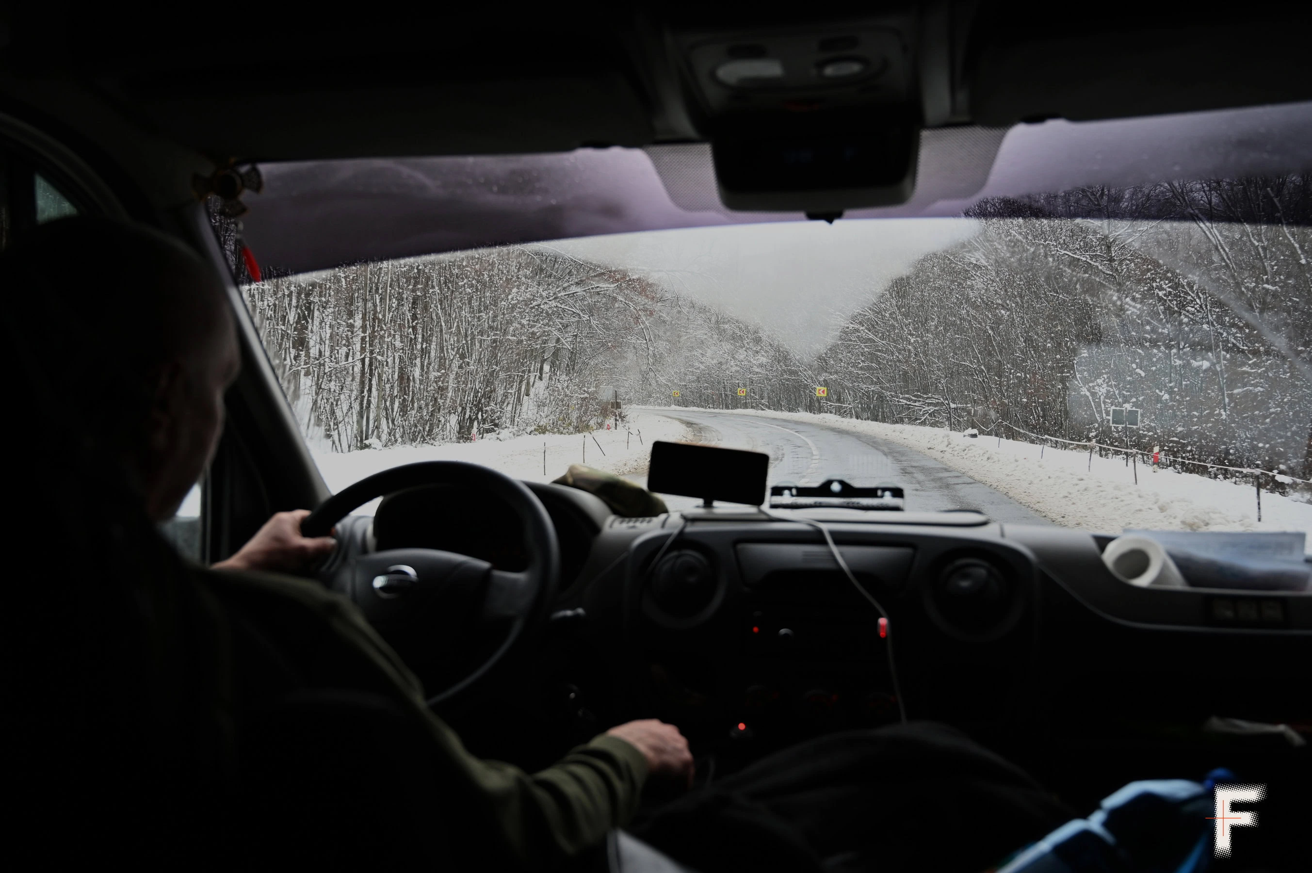 Сьогодні у Валерія Поповича завдання перевезти тіло військового харків’янина в Івано-Франківську область, де загиблого перевантажать в іншу машину та повертатимуть додому на схід. Тут, в Ужгороді, проводили ДНК-експертизу, а тепер полеглий здійснить ще одну подорож у понад тисячу кілометрів – останню. Назустріч Валерію Поповичу їхатиме машина з тілами загиблих захисників, серед яких буде і закарпатець – його потрібно забрати і перевезти до Ужгорода – ближче до села, де на солдата вдома чекають рідні. Сірий ранок біля ужгородського моргу. Валерій вантажить тіло загиблого воїна в мікроавтобус. Неспішно, обережно, впевнено. Рухом руки показує, що можна сідати в машину – там є невеличке спальне місце на випадок дальніх рейсів або непередбачуваних ситуацій, коли доведеться довго чекати на точці стиковки. Вже у дорозі розповість, що мають у родині традицію – давати власним автомобілям імена. Цей бус назвали Журавликом. Журавлик вирушає в Карпати. По засніжених дорогах, поміж гірських краєвидів наближає до когось горе. Місце зустрічі з іншими волонтерами – Долина, Івано-Франківщина. Попереду майже чотири години шляху та розмов. Тетяна працює вчителькою зарубіжної літератури та відповідає за культурні події у школі у Вишкові, Валерій з дерева може виготовити майже усе – від посуду до сходів. Мають 35-річного сина Дмитра, який служить у ЗСУ. З початком повномасштабного вторгнення Росії в Україну Валерій більше зосереджений на волонтерській роботі, ніж на роботі з деревом, яку раніше так любив. Він почав повертати тіла загиблих військових додому випадково: знайомі попросили привезти тіло полеглого воїна з Донеччини до Воловця. Тоді за ним Валерій поїхав на звичайному, ніяк не обладнаному мікроавтобусі. Врятувало те, що була зима. «Я пішов, купив труну. І так перевезли у Воловець. Це був чоловік із «Карпатської Січі». Іван Лесюк», – каже Валерій. Тепер Валерій і Тетяна везуть ще одного небесного – так вони між собою називають полеглих військових. Воїн – із Харківщини. Багато даних про нього немає. Після експертизи його везуть додому – через маленькі гірські села, через мальовничі засніжені Карпати, через всю країну, яку захищав. "Я вже не можу це залишити. Не можу інакше. Я не хотів цим займатись", каже Валерій. Валерій Попович у дорозі назустріч іншим учасникам місії "На щиті", Закарпаття, 23 листопада 2025 року. Анна Семенюк / Frontliner Робота Журавлика