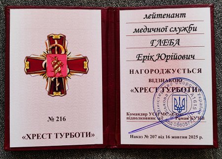 "Сьогодні маю за честь отримати відзнаку «Хрест Турботи». Ця нагорода для мене — не просто метал, а символ нашої спільної щоденної боротьби за життя тих, хто стоїть на захисті України." - написав військовослужбовець на власній сторінці у Фейсбук.