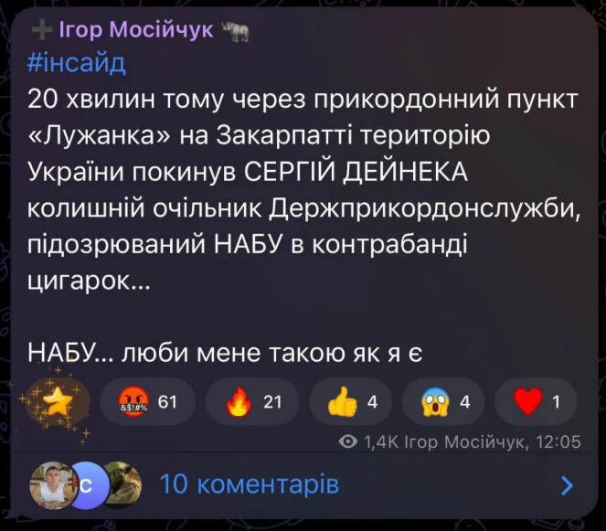 Зокрема, таку інформацію у телеграм-каналі поширив екснардеп Ігор Мосійчук. Ігор Мосійчук о 12:05 повідомив, що ексглава ДПСУ виїхав з України через прикордонний пункт "Лужанка" на Закарпатті.