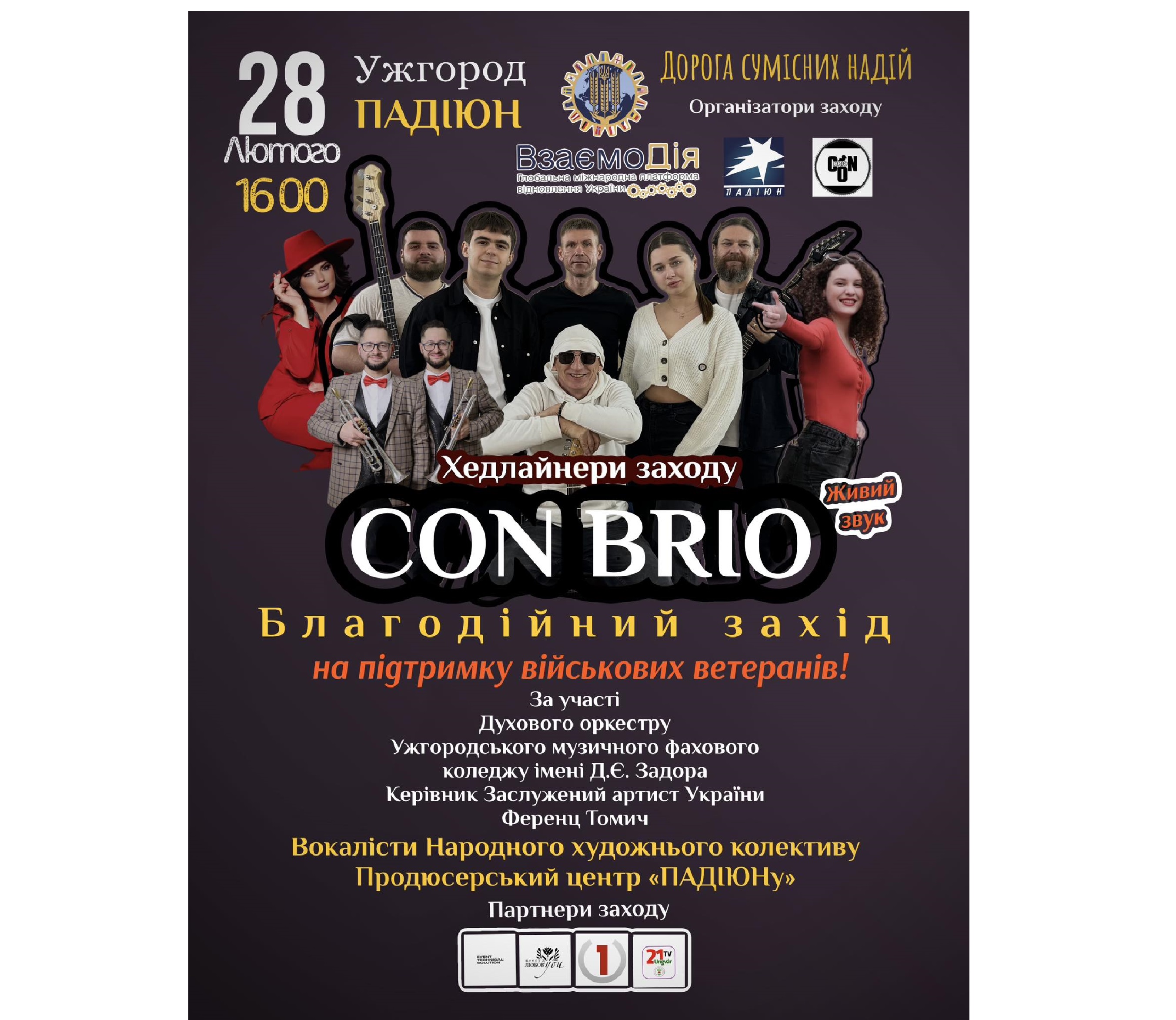 Запрошуємо вас підтримати наших військових ветеранів на благодійному заході «Дорога сумісних надій», який відбудеться 28 лютого о 16:00 в місті Ужгород у КЗ «ПАДІЮН».Хедлайнери заходу: