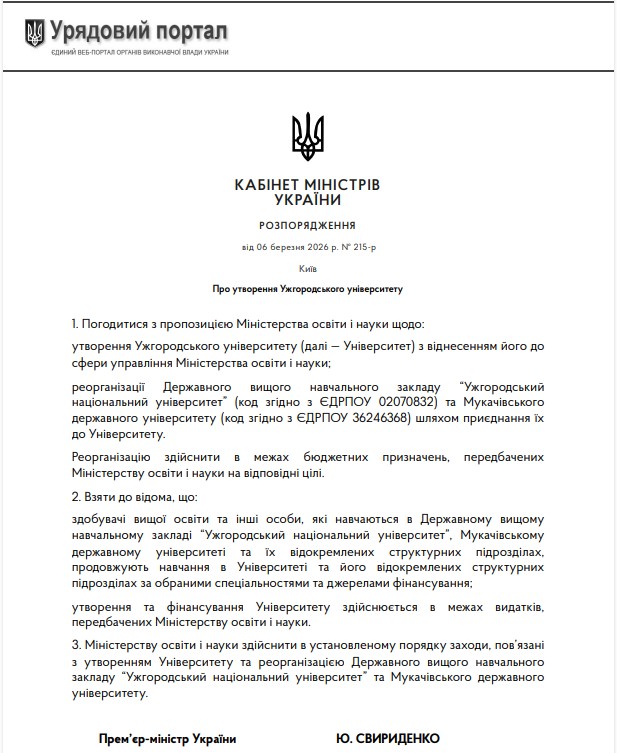 6 березня 2026 року Кабінет Міністрів України опублікував розпорядження "Про утворення Ужгородського університету". Згідно із розпорядженням, уряд погодився з пропозицією Міністерства освіти і науки щодо створення Ужгородського університету шляхом реорганізації двох закладів: