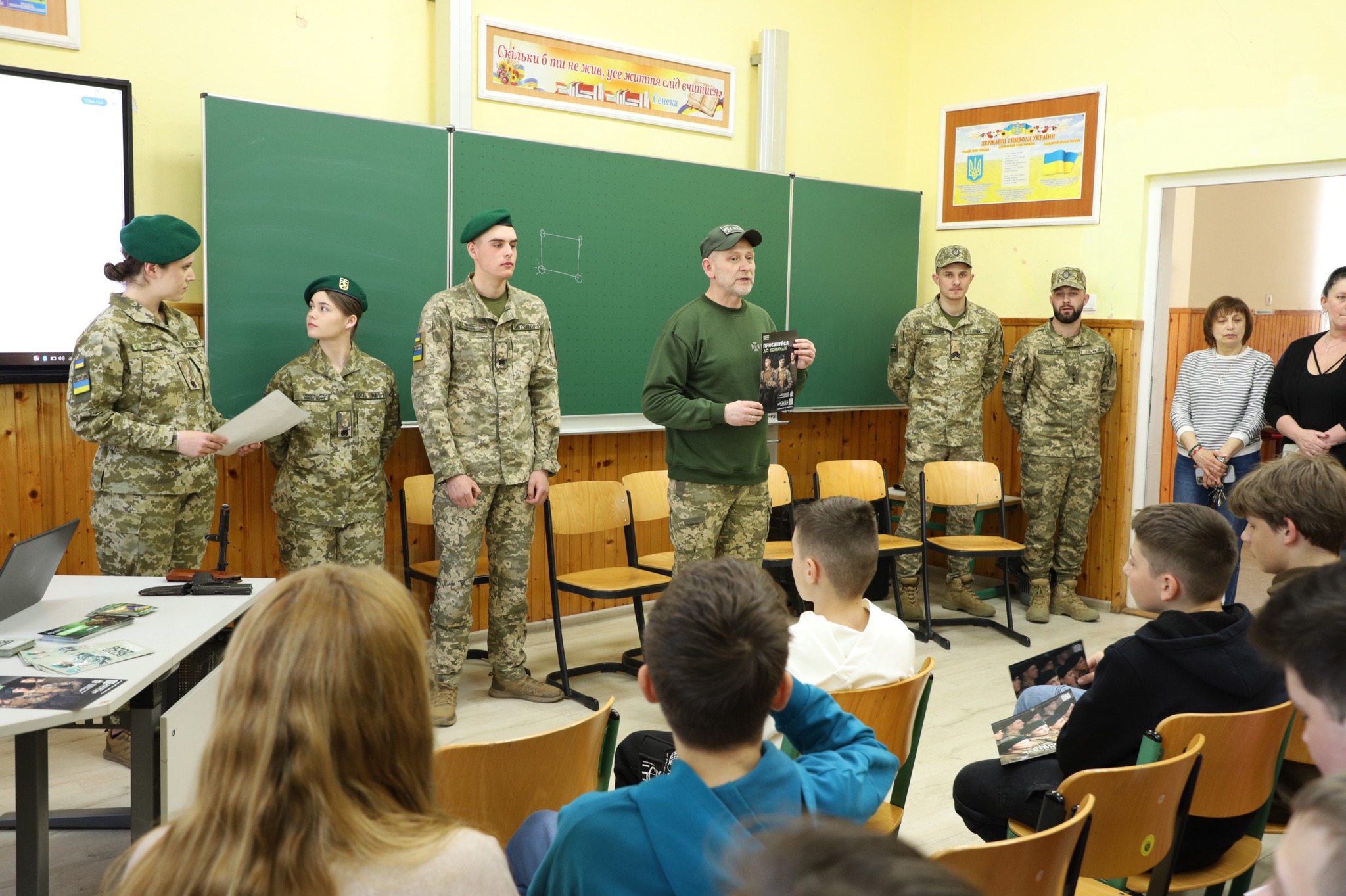 Керівник групи рекрутингу Чопського прикордонного загону В’ячеслав Шинкарьов поділився зі школярами досвідом служби, розповів про можливість проходження військової служби за контрактом і перспективи кар’єрного зростання для військовослужбовців. Він наголосив, що вибір престижної професії захисника державних рубежів не лише накладає певні обов’язки та обмеження, а й пропонує низку соціальних гарантій і переваг.