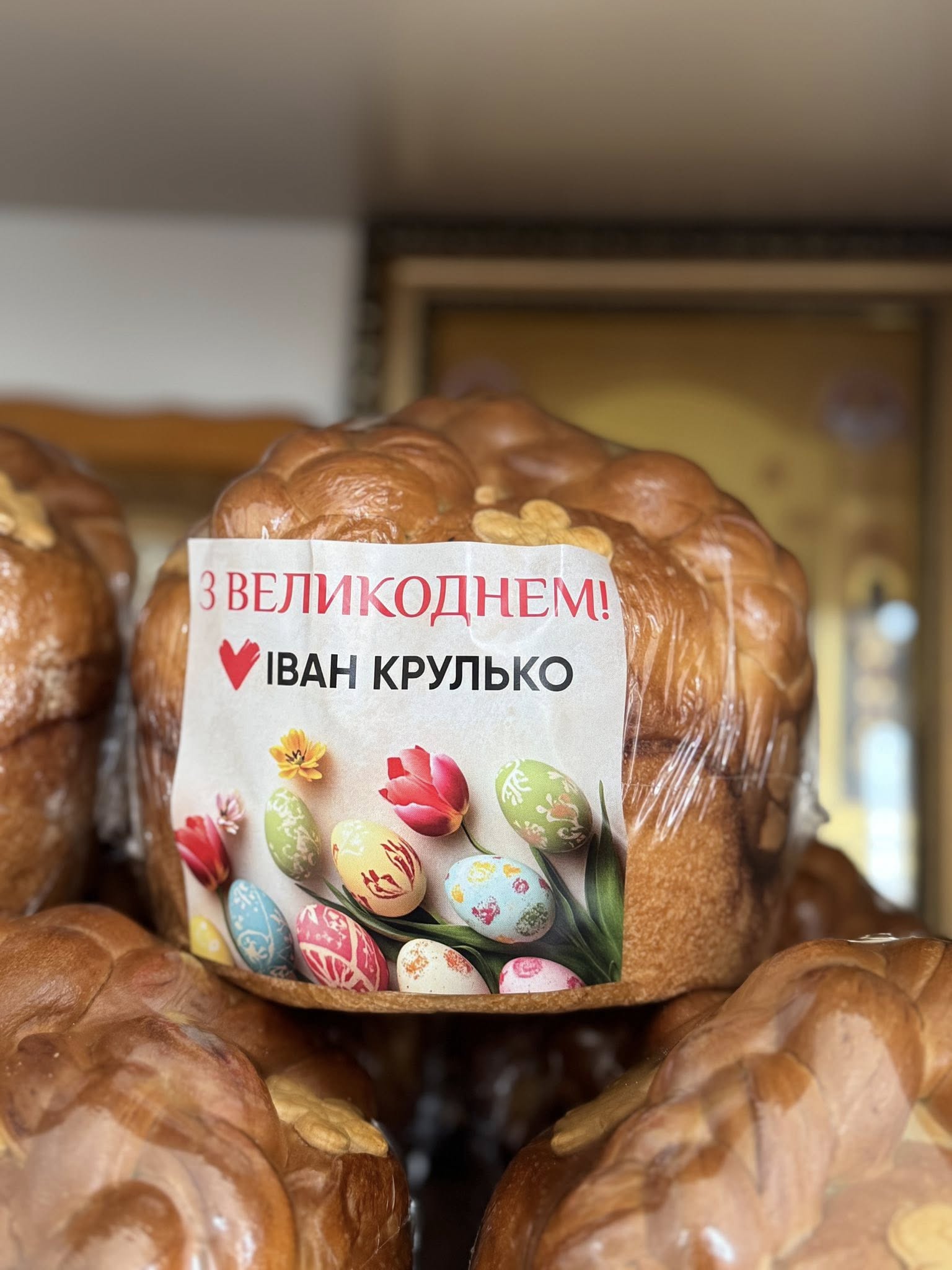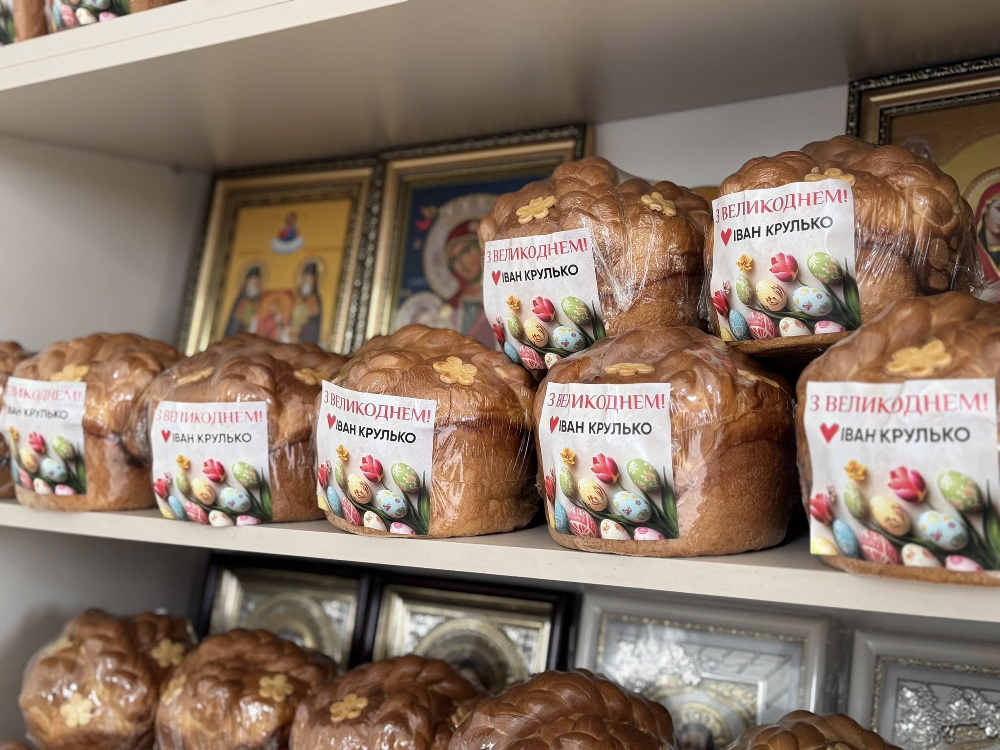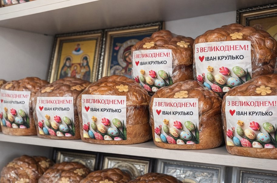 На фотографіях, оприлюднених на фейсбук-сторінці храму, видно, що кожна з пасок містить у пакуванні листівку з надписом «З Великоднем! Іван Крулько» та партійну символіку ВО «Батьківщина».
