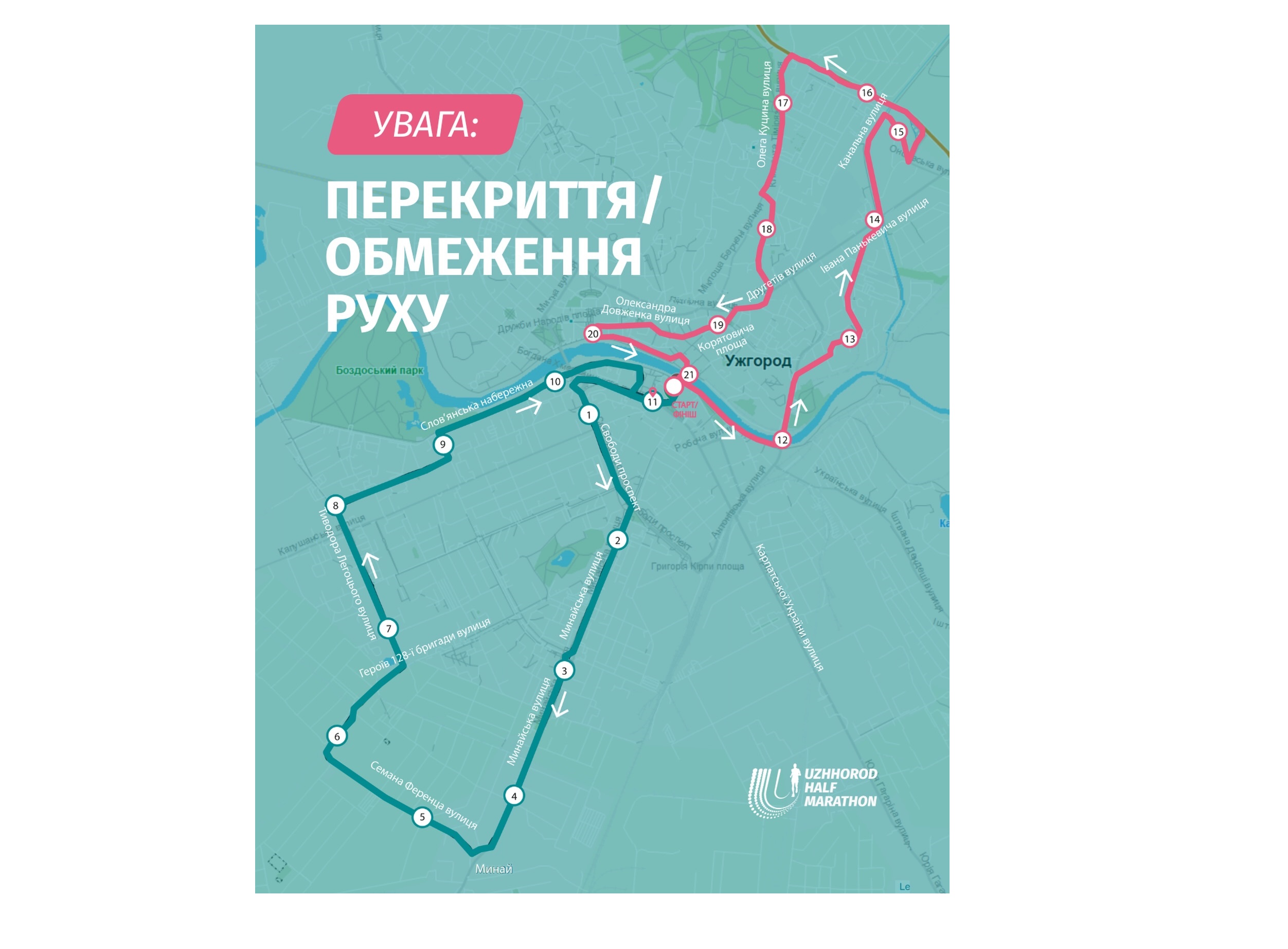 У неділю, 19 квітня, у зв’язку з проведенням в Ужгороді благодійного півмарафону «UZHHOROD HALF MARATHON» на площі Шандора Петефі, біля ЗОШ № 9, тимчасово буде перекрито рух транспорту на ділянці від перехрестя з вул. Олександра Митрака до перехрестя з вул. Івана Чендея з 06:00 до 14:00.