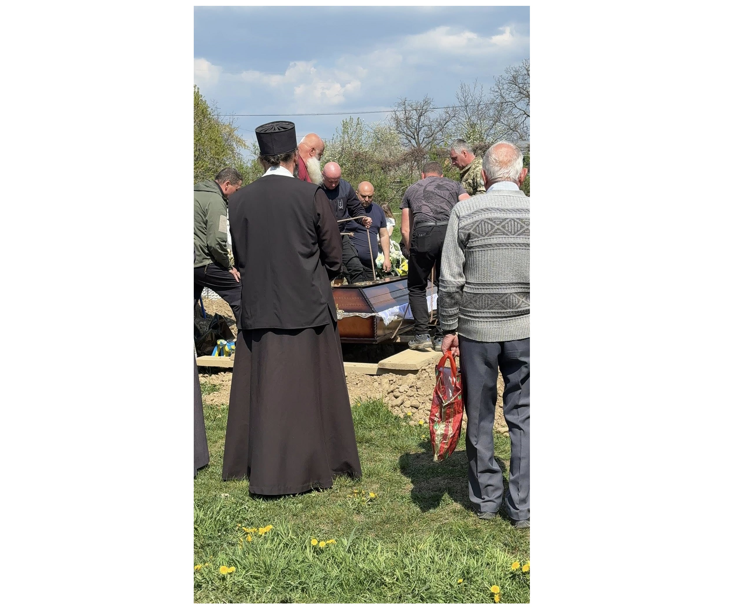 Небо було ясне й безхмарне. Сонце світило так, ніби навмисно освітлювало все: і труну, і хрест, і заплакані очі. Біля нього стояли найдорожчі — дочка, внуки, рідні… і все село.