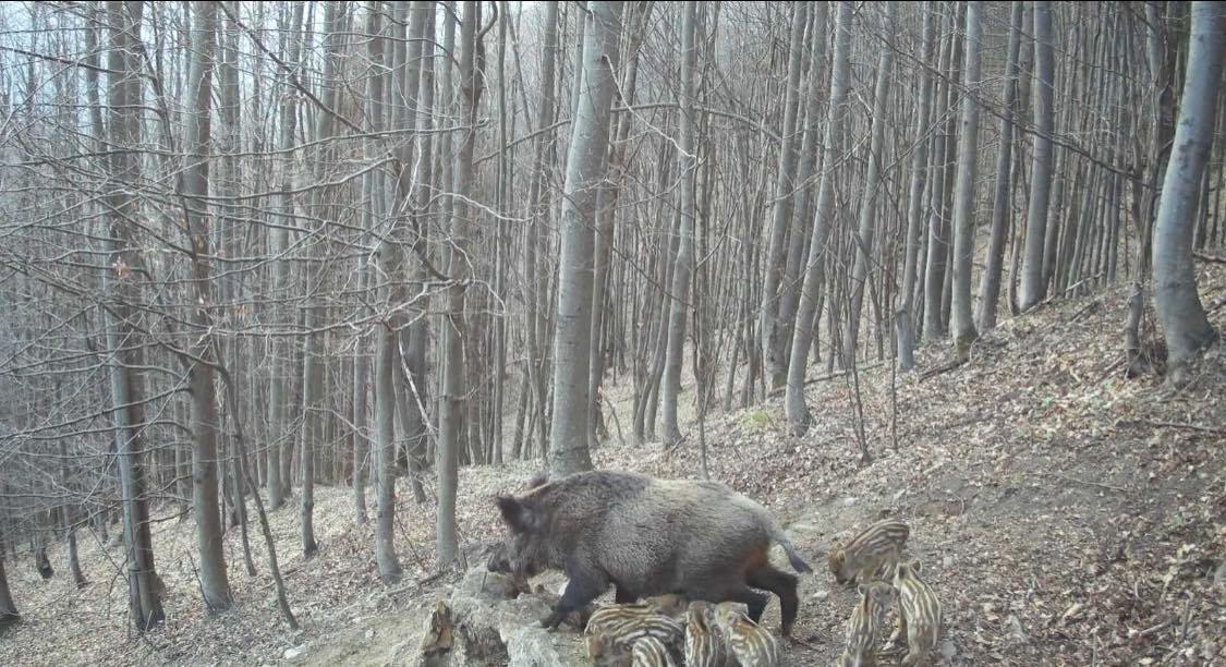 Фотопастка зафіксувала характерний для весняного періоду момент - самку кабана разом із молодняком. Саме в цей час народжуються поросята, і тварини формують невеликі родинні групи. Перед появою потомства самка облаштовує гніздо з трави, листя та гілок, створюючи безпечні умови для новонароджених.