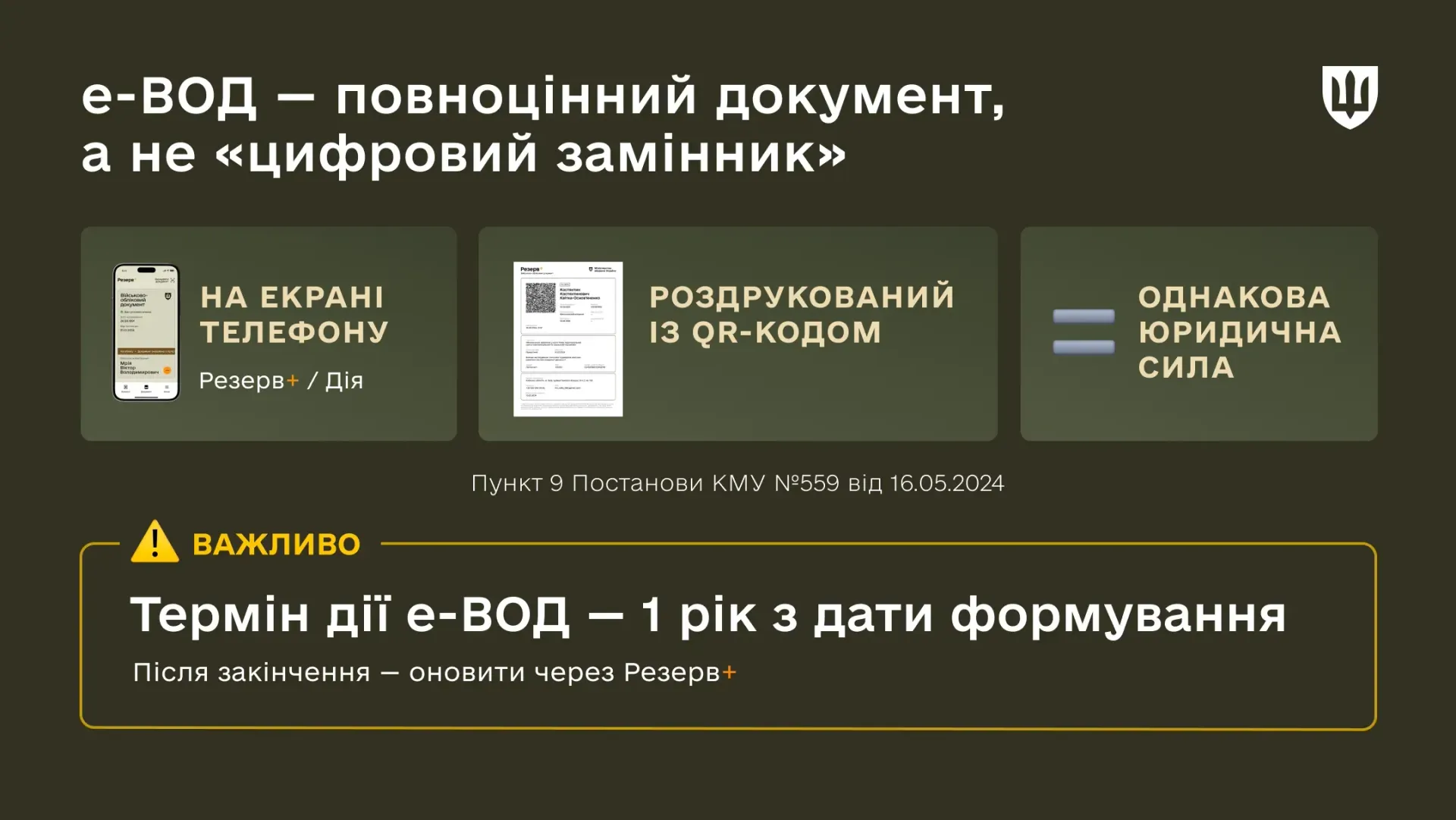 Постанови КМУ №559 від 16 травня 2024 року «Про затвердження Порядку оформлення (створення) та видачі військово-облікового документа для призовників, військовозобов'язаних та резервістів»: електронний військово-обліковий документ у будь-якій формі – відображений на екрані телефону або роздрукований –