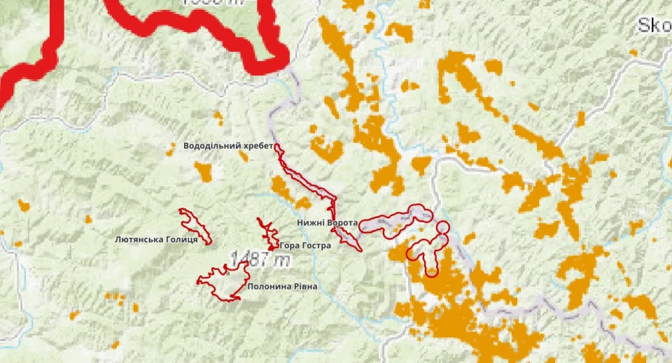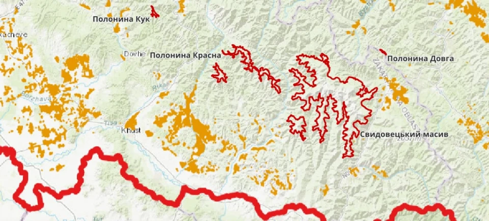 На картосхемах, що стосуються Закарпатської області, червоним кольором позначено території, які планують забудувати вітровими електростанціями. Ці ділянки охоплюють високогірні масиви, такі як Свидовець, Полонина Красна, Полонина Руна та Вододільний хребет. Водночас зони, рекомендовані Енергетичним Співтовариством (позначені помаранчевим), розташовані переважно в інших локаціях і не перетинаються з планами забудовників на гірських хребтах.