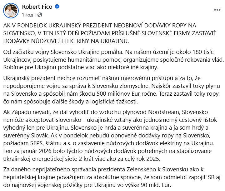 Прем’єр-міністр Словаччини Роберт Фіцо заявив, що ініціювати припинення постачання електроенергії в Україну, якщо до понеділка не буде відновлено транзит російської нафти трубопроводом "Дружба".
