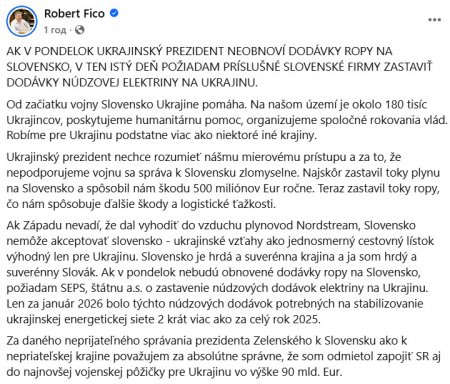 За його словами, раніше було припинено транзит газу до Словаччини, що, як він стверджує, завдає країні збитків у розмірі близько 500 мільйонів євро щороку. Тепер, за його оцінкою, зупинка постачання нафти створює нові втрати та логістичні труднощі.